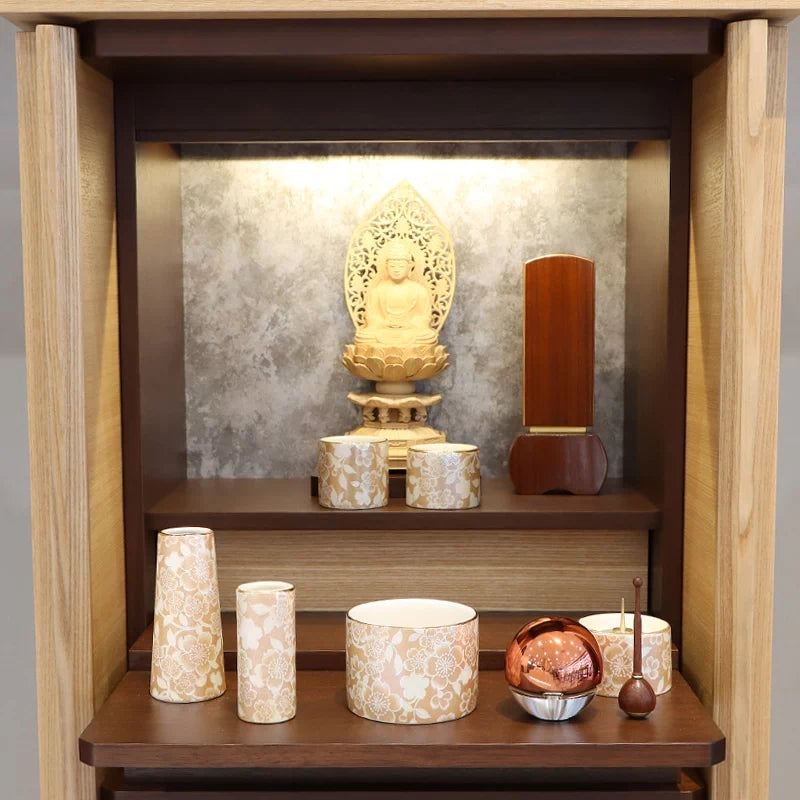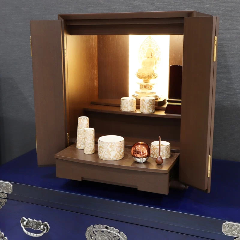 手元供養をするからこの形状のお仏壇でなければいけないということはありません。手元供養のされる方に人気の「ミニ仏壇」でも良いですし、通常のお仏壇の中に入れて頂いても大丈夫です。全骨を自宅で供養していく予定の場合は「下部に納骨が可能な床置き仏壇」や「納骨が可能な仏壇台・家具」などを設けることをおすすめいたします。
