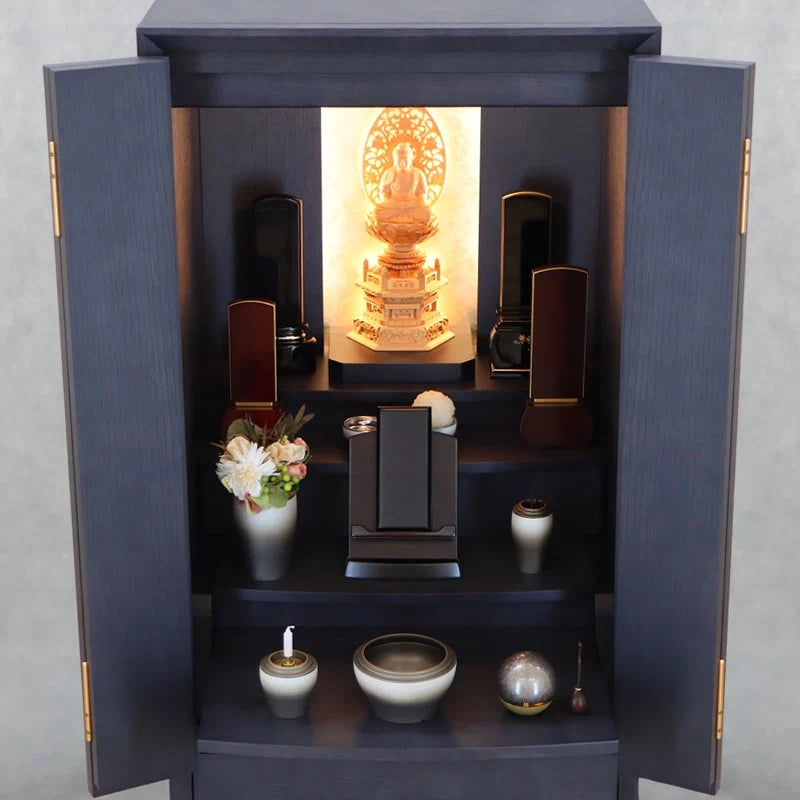 ご本尊には桧木製の仏像をセット。ルミエールでは高級な仏像もセット価格でご用意いたします。ご本尊の両脇にはスタンド型掛け軸「遥」ウォールナット色をセット。ご本尊と脇侍をセットしたより丁寧な祀り方です。仏具は着物の衿をイメージしてデザインされた仏具をチョイス。おリンには、低く長い音色の「煌リン銀結晶」を組み合わせました。青みがかったお仏壇に、シルバーの仏具を合わせたスタイリッシュな組み合わせです。