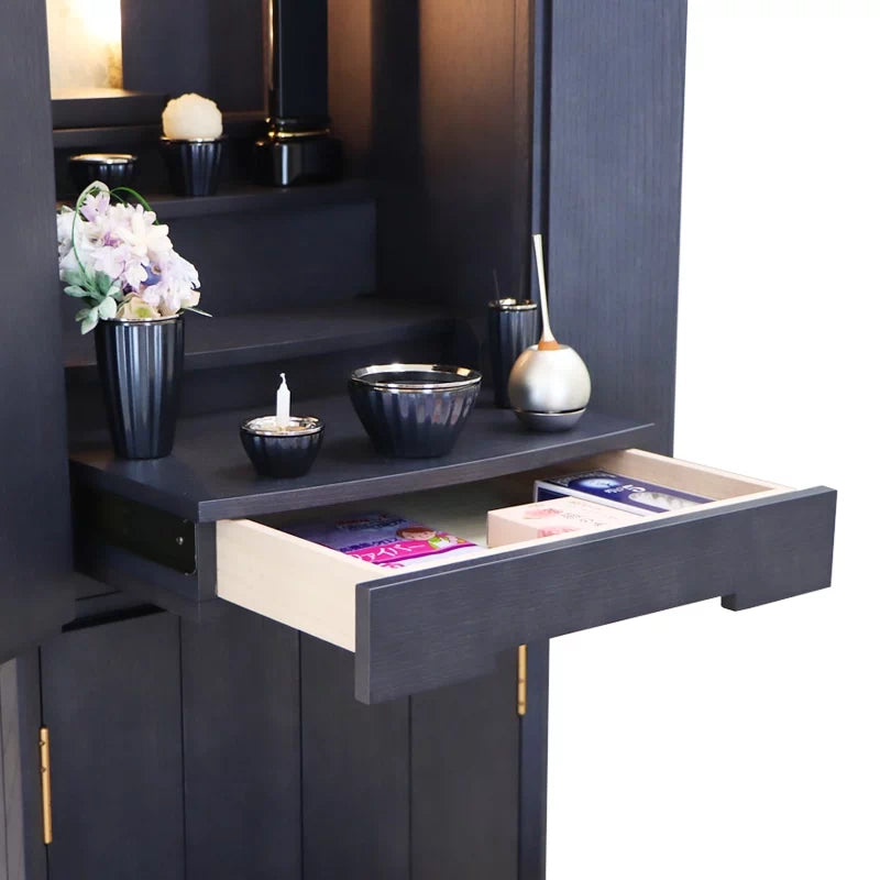 • 中間部のスライド式仏具板の下には、引出しが内蔵されており、少ないスペースで2つの機能を兼ね備えています。引出しには故人様の思い出の品や、お仏壇周りの仏具や小物などをお納めいただけます。スライド式仏具板を引き出すことで、ゆったりとしたスペースでお祀りいただけます。