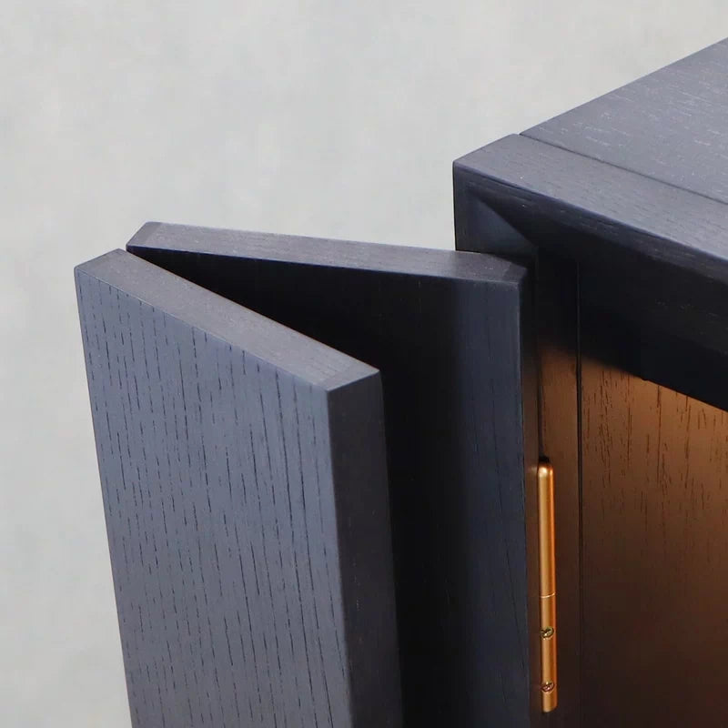木材には青森・秋田・岩手、3県の東北地方で産出された「栓(せん)」と言われる国産の木材を使用しております。「栓」は国内市場の中でも東北地方の寒冷地で算出されるものが木目が詰まっていて良質でブランド化されており、本仏壇は東北地方産の「栓」のみを使用しております。国産木材を使用した国内生産品ですので純国産のお仏壇となります。その上から青みがかった墨で染め上げた品のある落ち着いた色合いです。