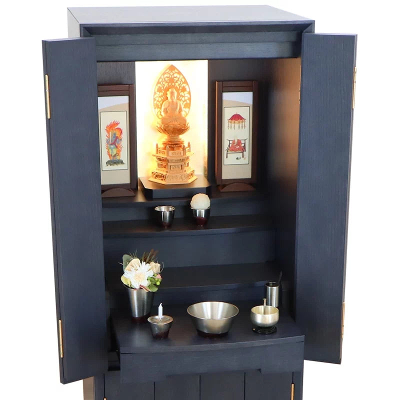 • 特 徴: 国産品 、 LEDライト 、 本尊台あり 、 スライド式内部段 、 引き出し収納×2 、 7寸骨箱収納可能 、 経机付き 、 柾目の直線が多めの木目 、 床置きタイプ 、 セット仏壇の仏具シュミレーションあり