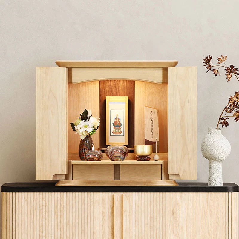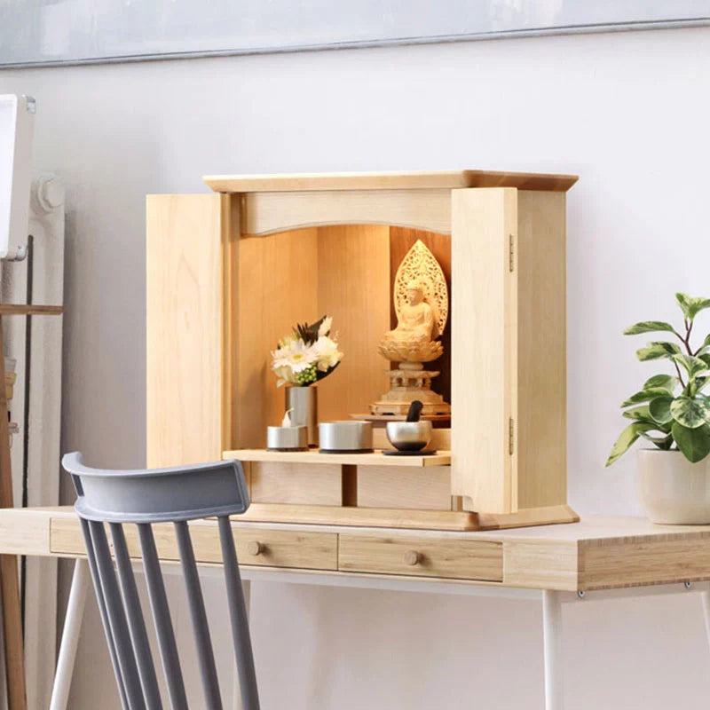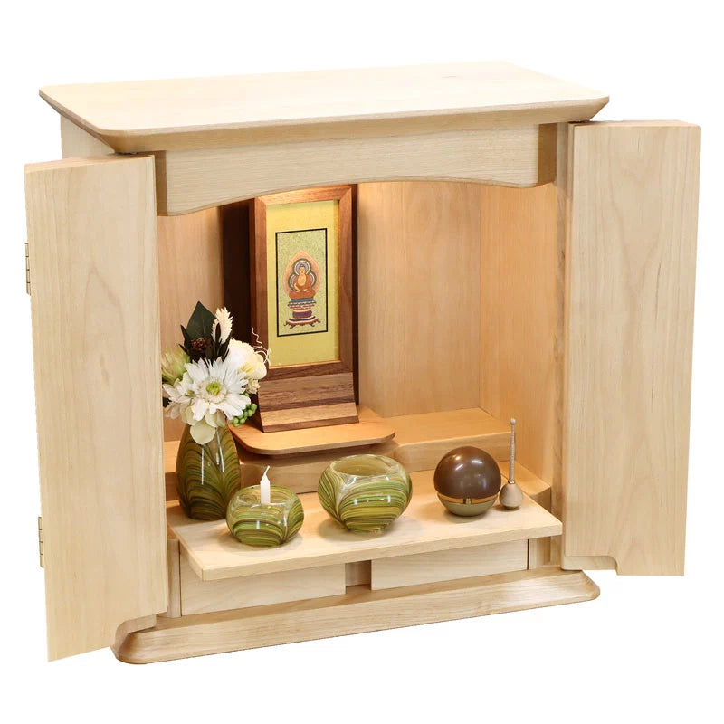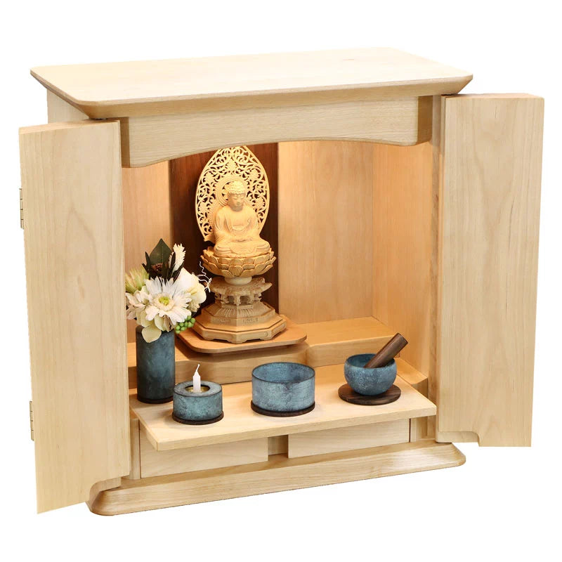 • 特 徴: 国産品 、 LEDライト 、 柾目の直線が多めの木目 、 本尊台あり 、 無垢材8割以上 、 仏板具 、 引き出し収納 、 セット仏壇の仏具シュミレーションあり 、 台の上に設置するタイプ