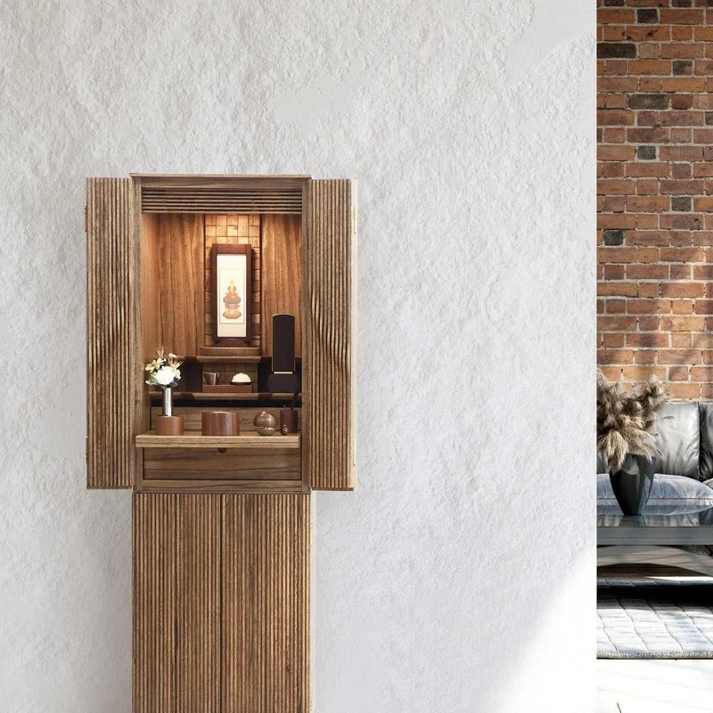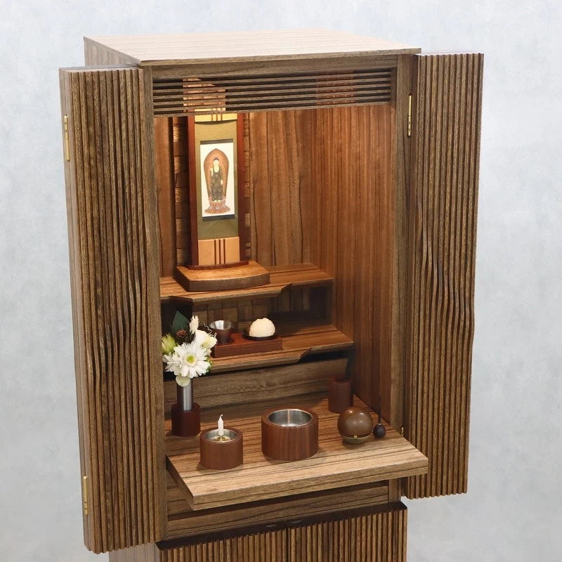 銘木のダイナミックな木目を活かした台付仏壇。和洋問わず現代のお部屋に馴染むスタイリッシュな佇まい。