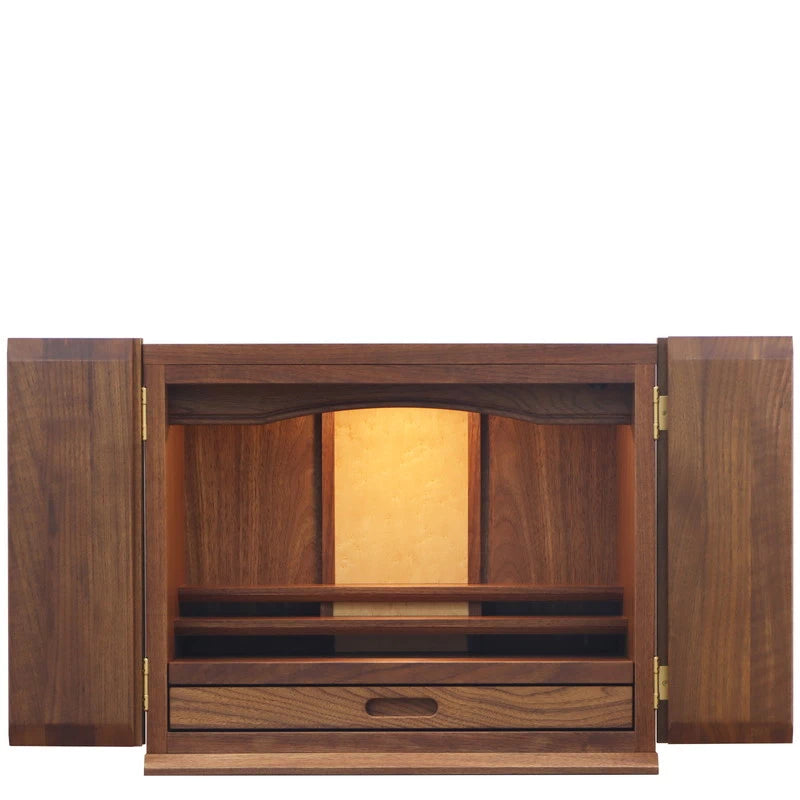 上置き仏壇には珍しく、横幅がたっぷりと広いデザインのお仏壇「ポルト」。ウォールナットの無垢材をふんだんに使用、質感を活かすオイル仕上げで、木の温もりを肌で感じられるあたたかみのあるルミエールオリジナルの国産仏壇です。
