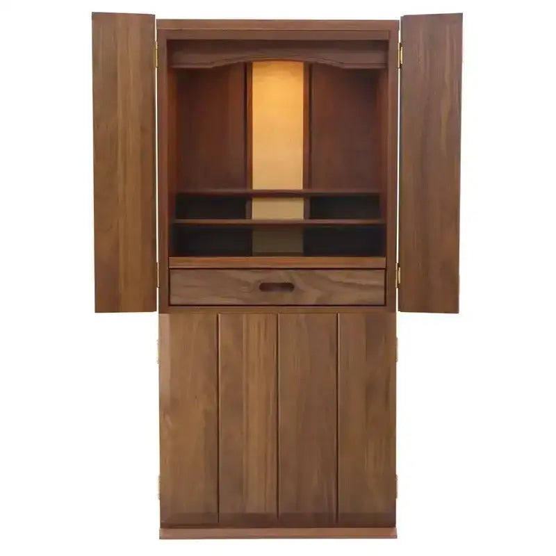 横幅がたっぷりと広いデザインのお仏壇「ポルト」。ウォールナットの無垢材をふんだんに使用、質感を活かすオイル仕上げで、木の温もりを肌で感じられるあたたかみのあるルミエールオリジナルの国産仏壇です。