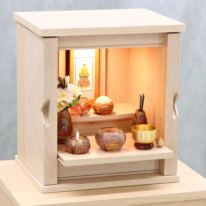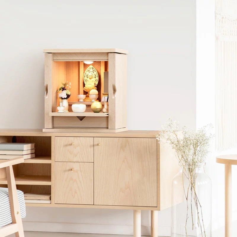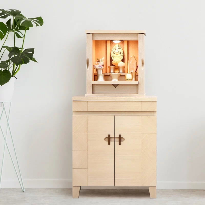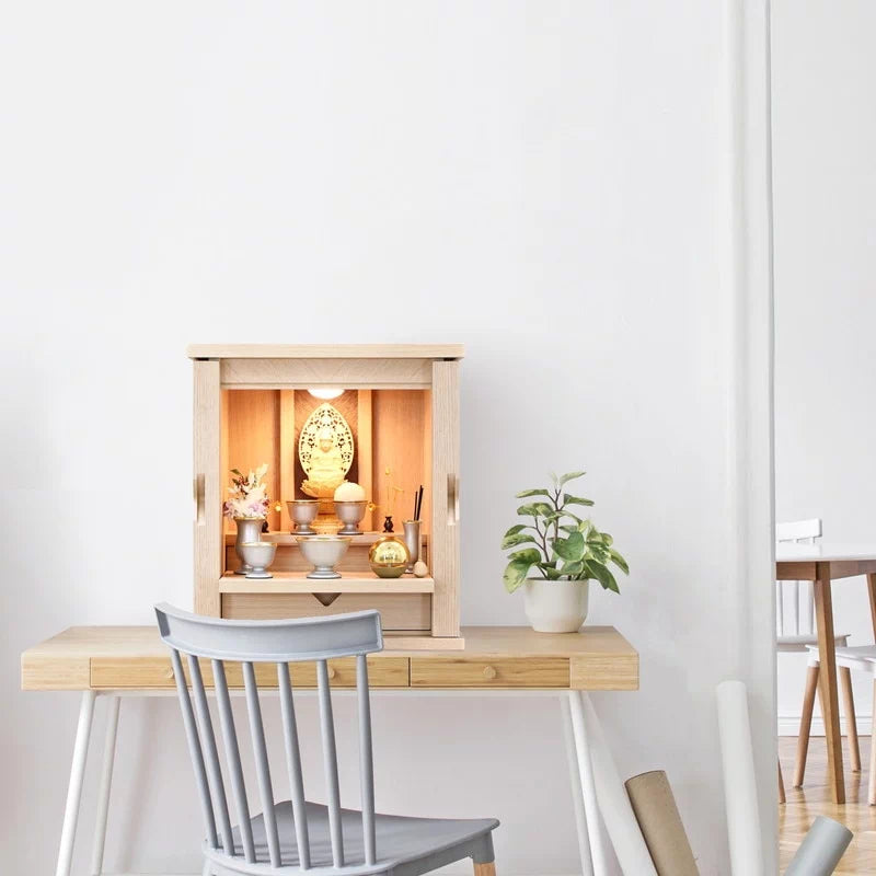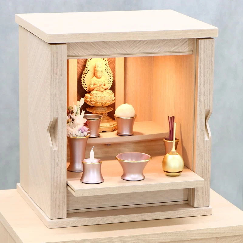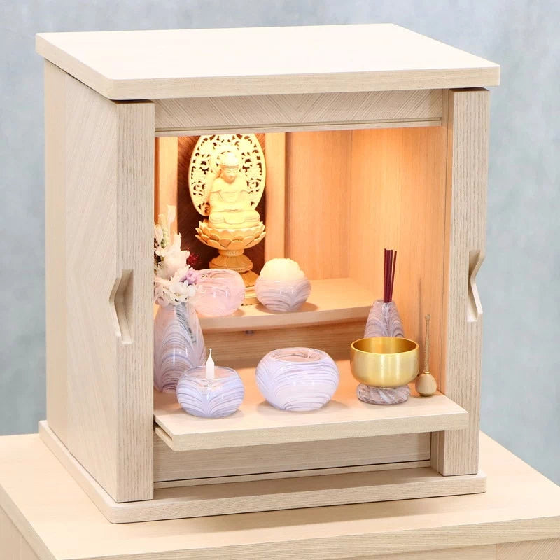 白色を帯び上品な色の木目がやわらかな雰囲気でお部屋に馴染みます。扉が側面に収まるコンパクト仏壇。