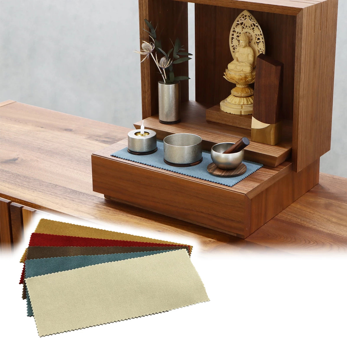 • 落ち着いた色合いのお仏壇に明るいキャメル色のマットがアクセントになる組み合わせです。マットを一枚敷くことでお仏壇の雰囲気を明るい雰囲気に変えることができます。