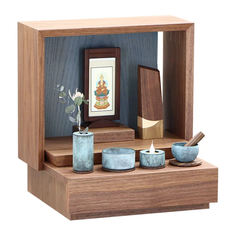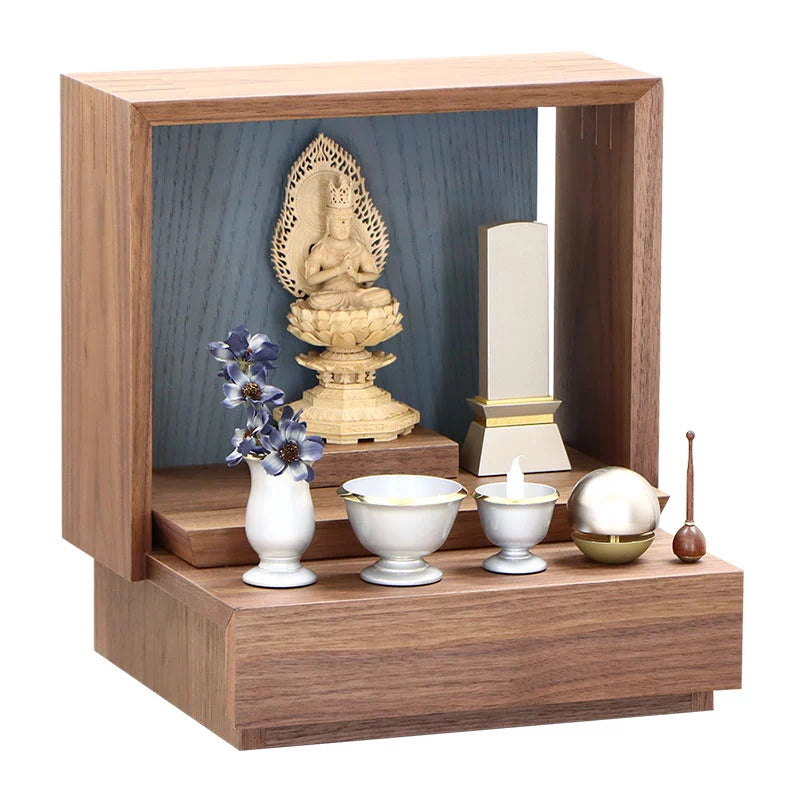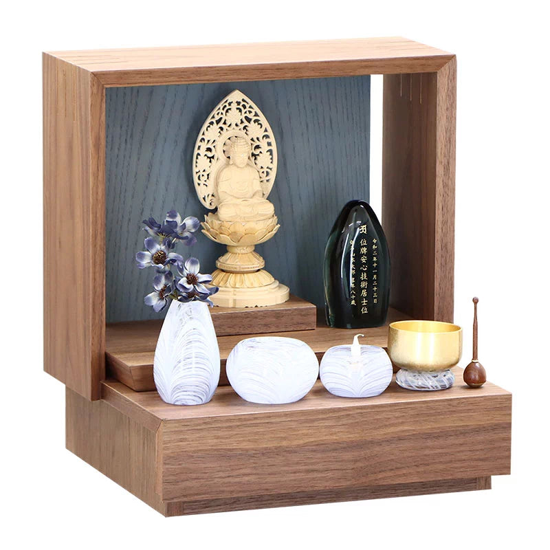 当店オリジナルの国産ミニ仏壇。ウォールナットにブルー合わせたシンプルモダンなデザイン。