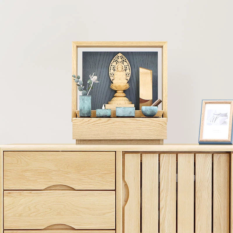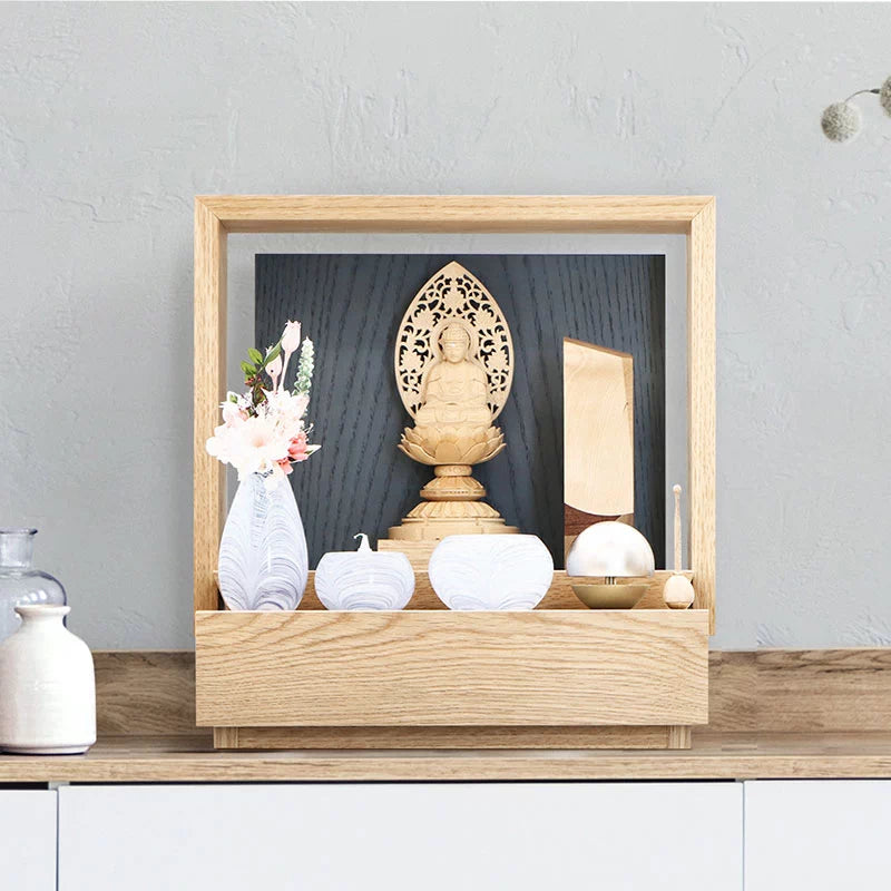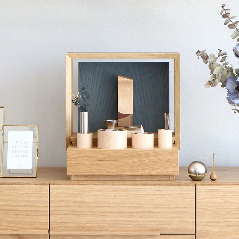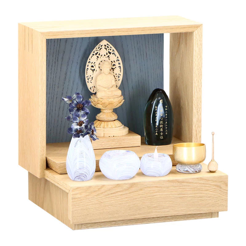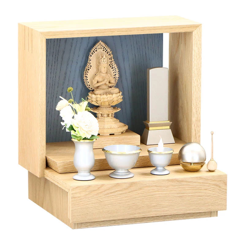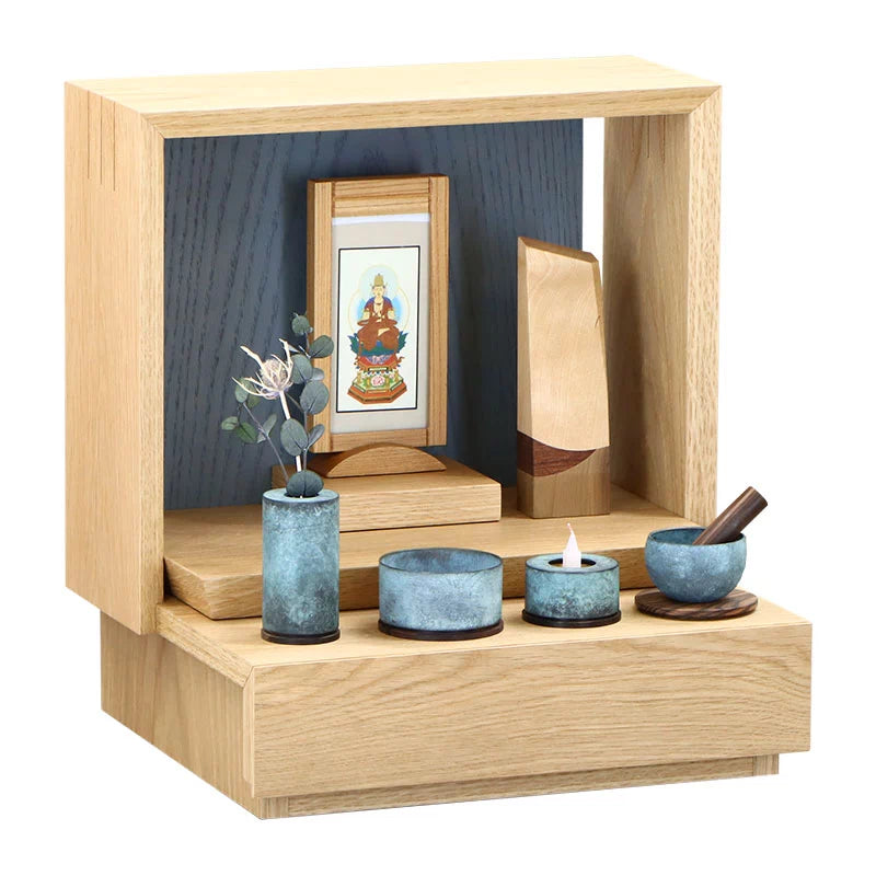 当店オリジナルの国産ミニ仏壇。オークにブルーがアクセントのシンプルモダンなデザイン。