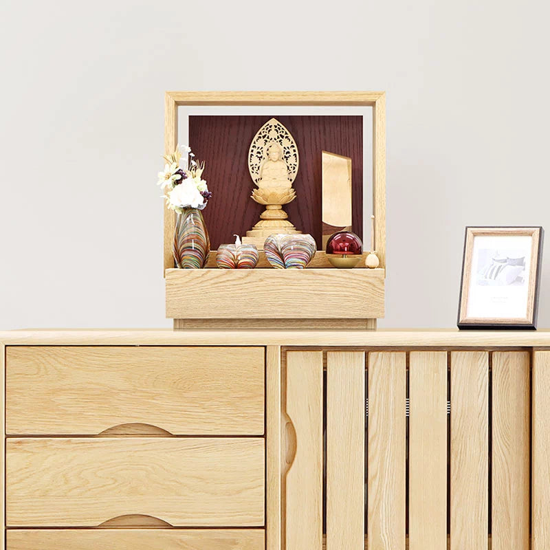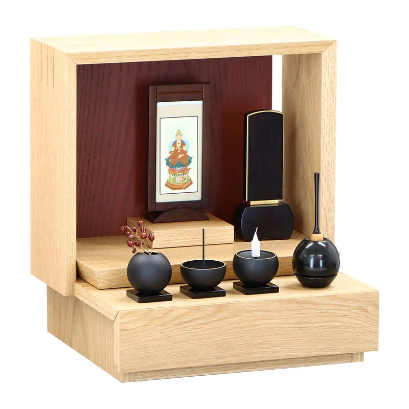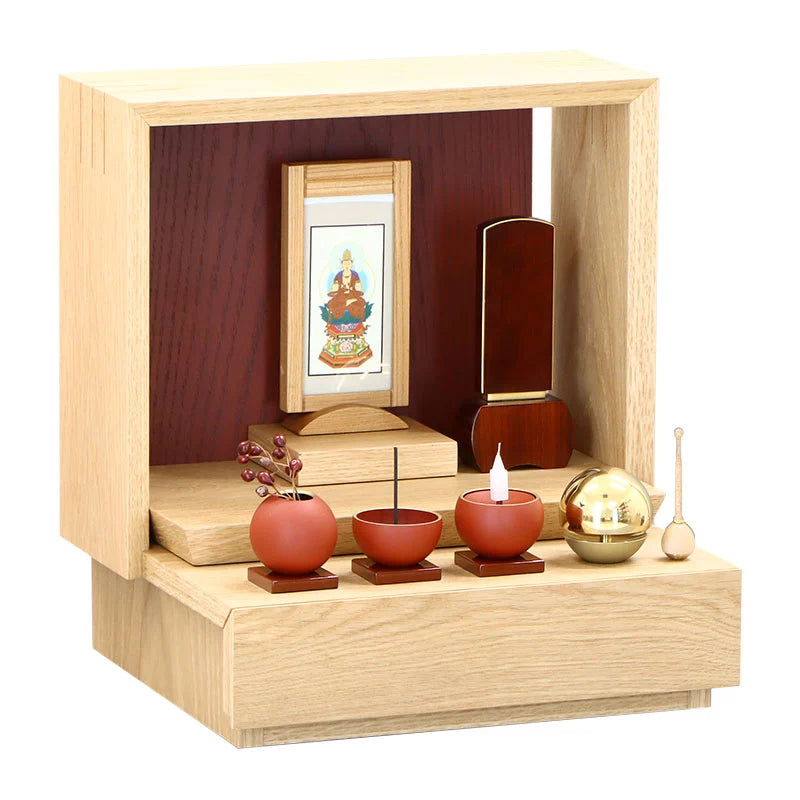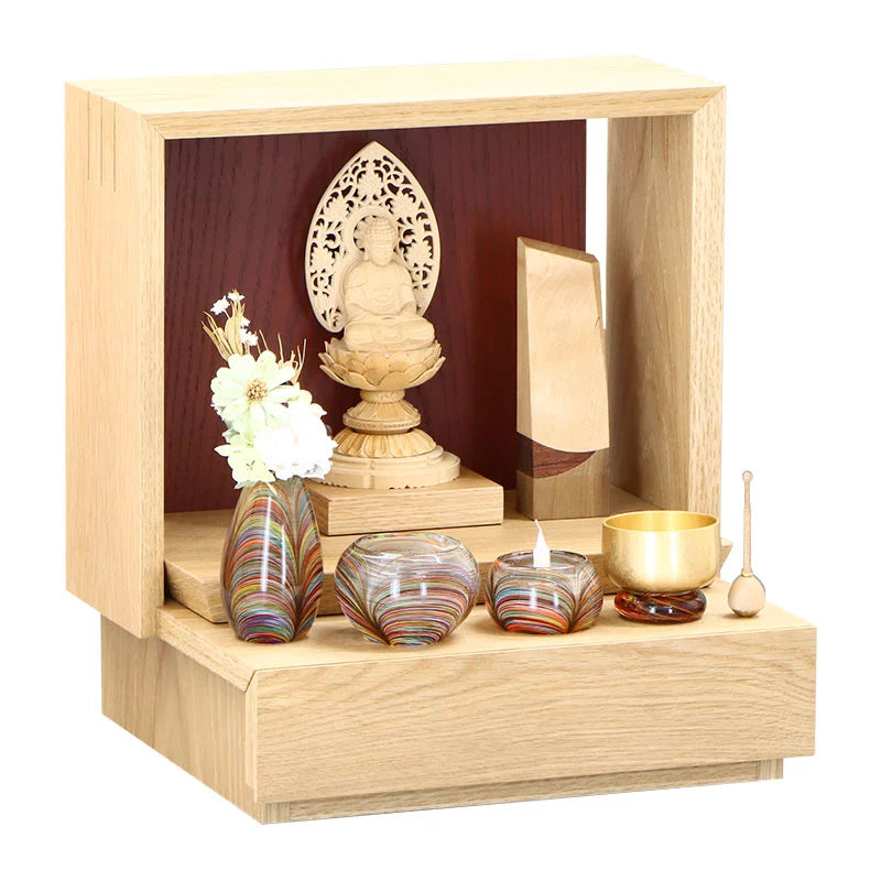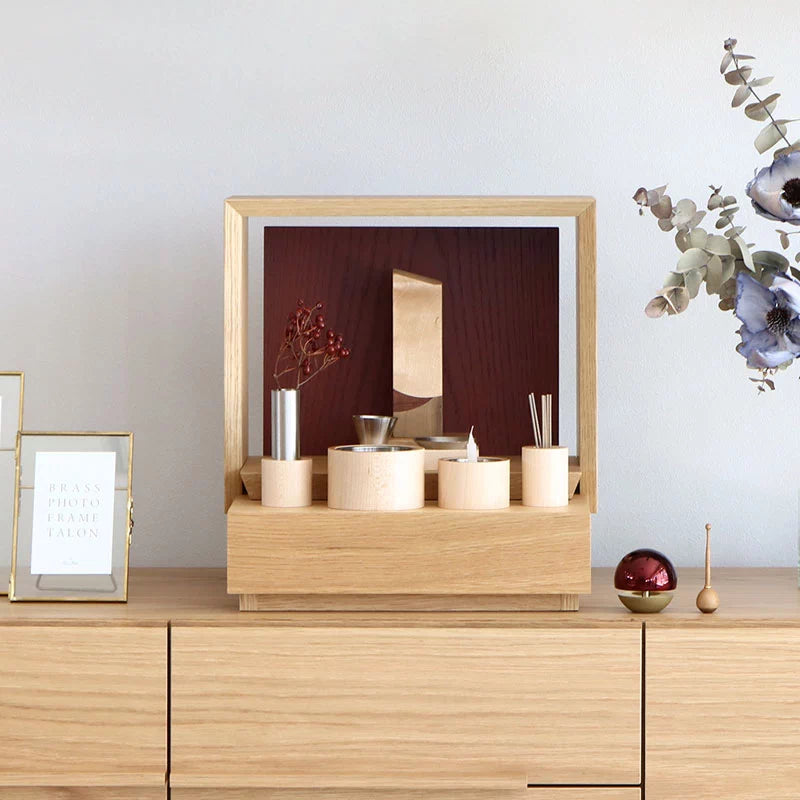 当店オリジナルの国産ミニ仏壇。オークにレッドがアクセントのシンプルモダンなデザイン。