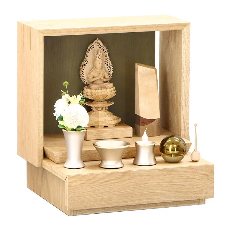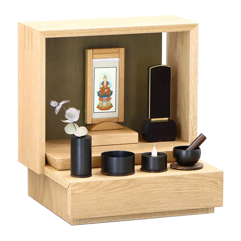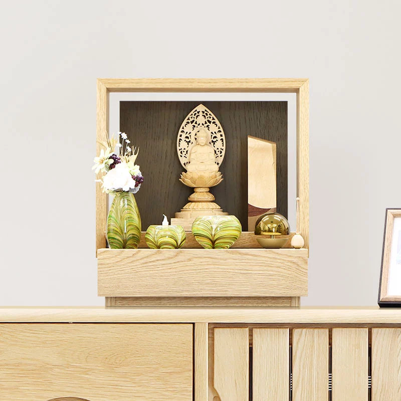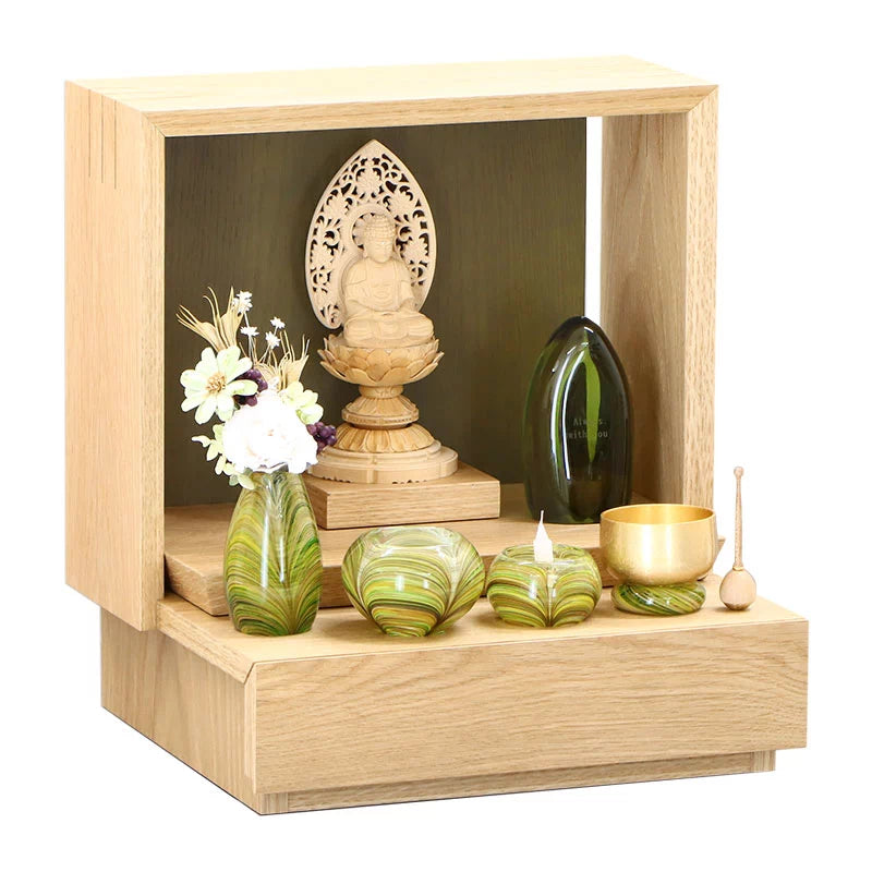 当店オリジナルの国産ミニ仏壇。オークにグリーンがアクセントのシンプルモダンなデザイン。