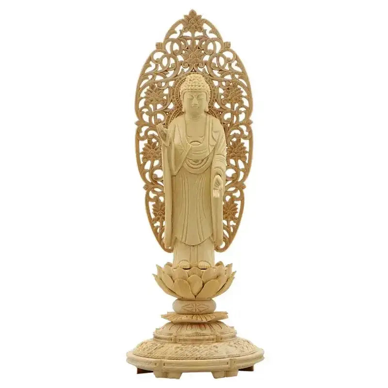 仏像の木材は馴染み深いヒノキ材を使用して一体一体、手彫りで彫られています。上彫り仕上げのとても細かい彫りで本柘植の仏像と比べますと重量感や彫りの細かさには劣りますが、美しい彫りはお値段以上の価値があります。桧木材の仏像は10年・20年と経年経過すると淡褐色になり、白檀や壇木などの仏像の色合いに近づき、重厚感が増していきます。