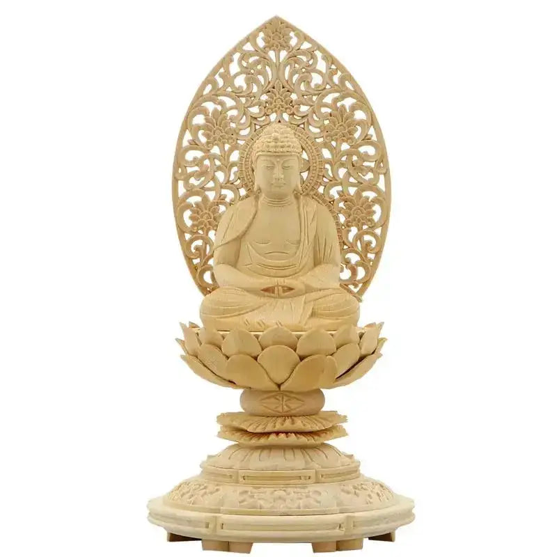 仏像の木材は馴染み深いヒノキ材を使用して一体一体、手彫りで彫られています。上彫り仕上げのとても細かい彫りです本柘植の仏像と比べますと重量感や彫りの細かさには劣りますが、美しい彫りはお値段以上の価値があります。桧木材の仏像は10年・20年と経年経過すると淡褐色になり、白檀や壇木などの仏像の色合いに近づき、重厚感が増していきます。