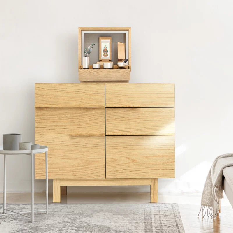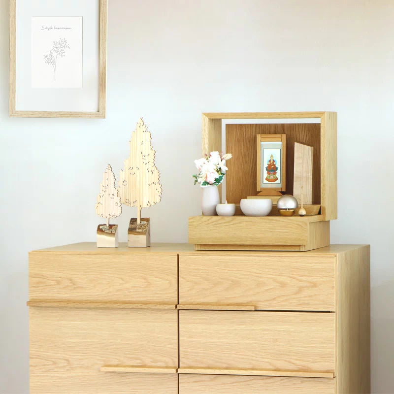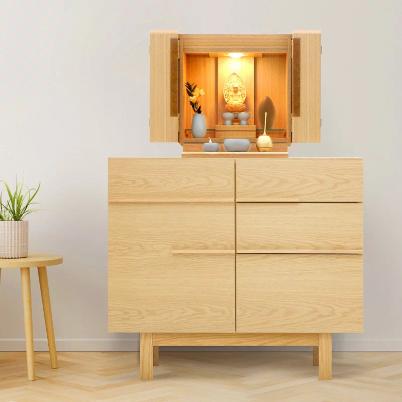 オークの木目を活かしたシンプルな佇まいが、お仏壇をモダンに演出します。