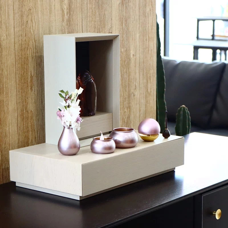 手のひらに収まるコンパクトなサイズと、見る角度によって表情を変える趣きのある色合いの3具足仏具。