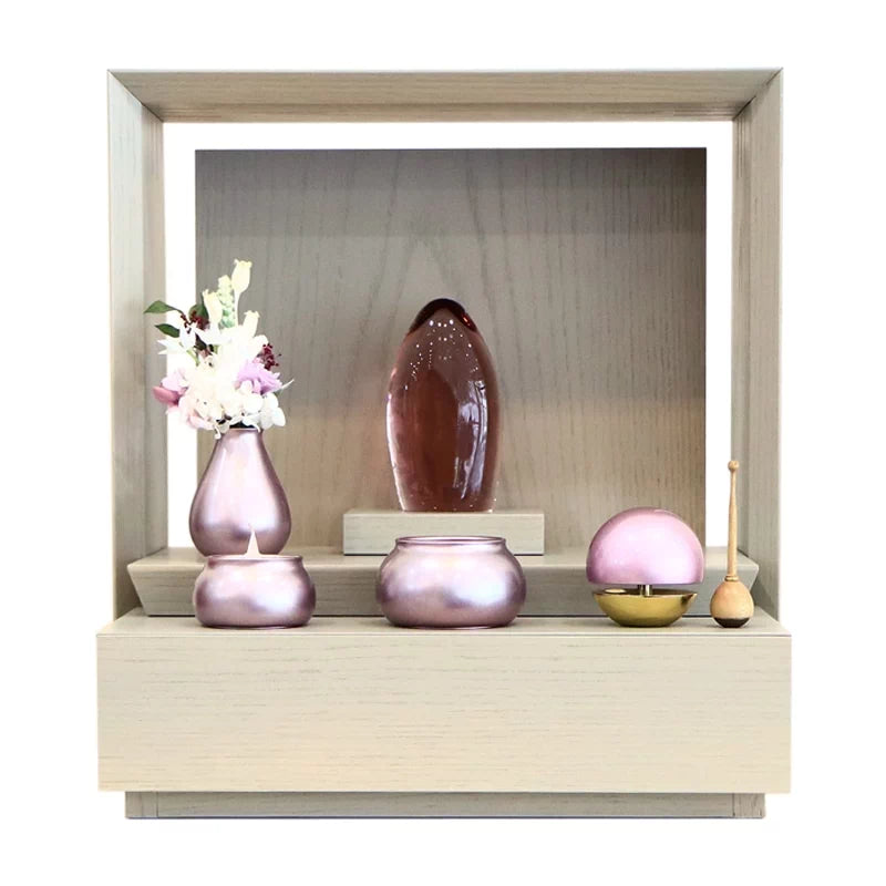 手のひらに収まるコンパクトなサイズで、趣のある色合いの3具足仏具。かわいらしいパールピンクの色合い。真鍮製のどっしりとした重みで安定感のあります。