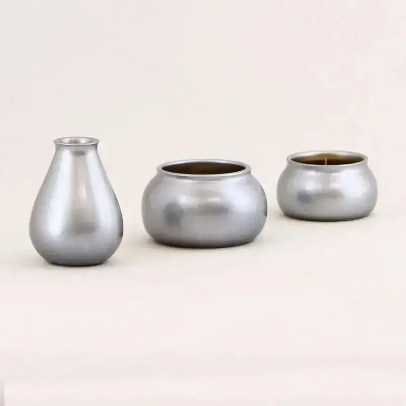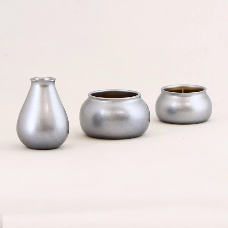 手のひらに収まるコンパクトなサイズと、見る角度によって表情を変える趣きのある色合いの3具足仏具。