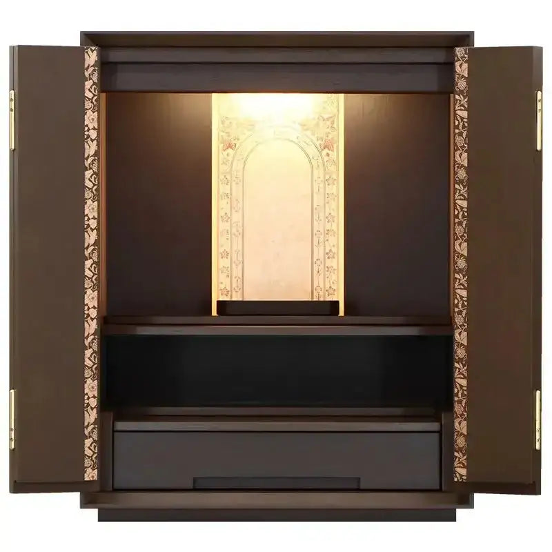 • 特 徴: 国産品 、 LEDライト 、 蒔絵技法 、 本尊台あり・須弥段取り外し可 、 スライド式内部段 、 引き出し収納 、 柾目の直線が多めの木目 、 セット仏壇の仏具シュミレーションあり 、 台の上に設置するタイプ