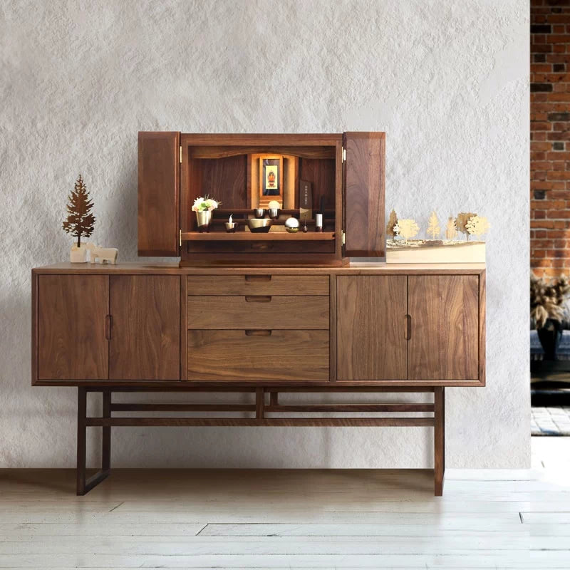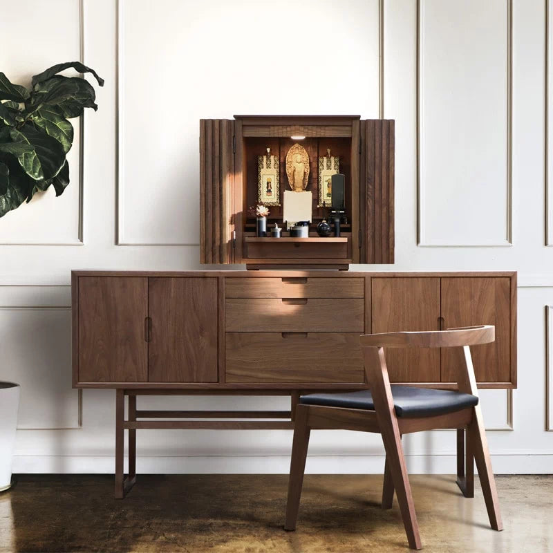 近年、お客様の購入内容をみると当店では「家具(サイドボード・チェスト)」の販売が非常に多くなっており、現在では仏壇台よりも出荷台数は多くなっております。お仏壇を家具と合わせて頂くことでお仏壇周りの雰囲気も一段とおしゃれにコーディネートして頂けます。一方、仏壇台の方は「仏具を置くスライド板」が設置されているものが多いのと、仏壇と同じメーカーが色を合わせて製作しているシリーズも一部あります。
