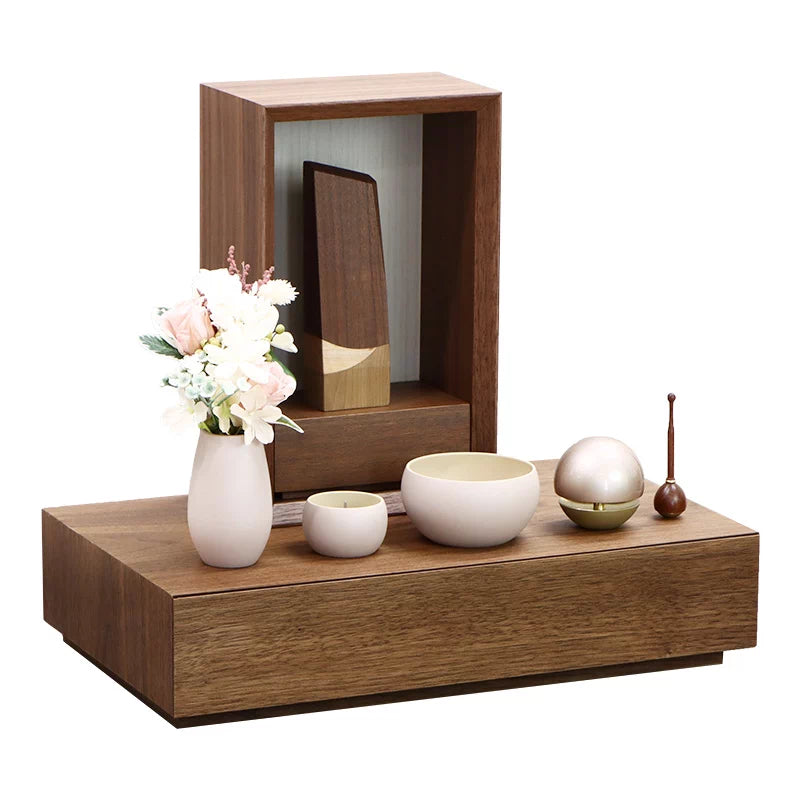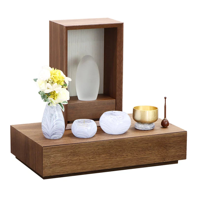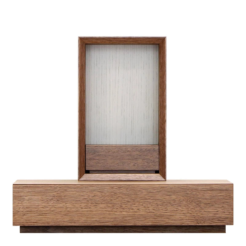 厨子(ボックス)内部の段は取り外し可能な形見箱となっているため、小さな遺品やお骨等を収納いただけます。 厨子・形見箱・引き出しがそれぞれ独立しているので、自由な形に組み合わせて飾り方をアレンジすることも可能です。