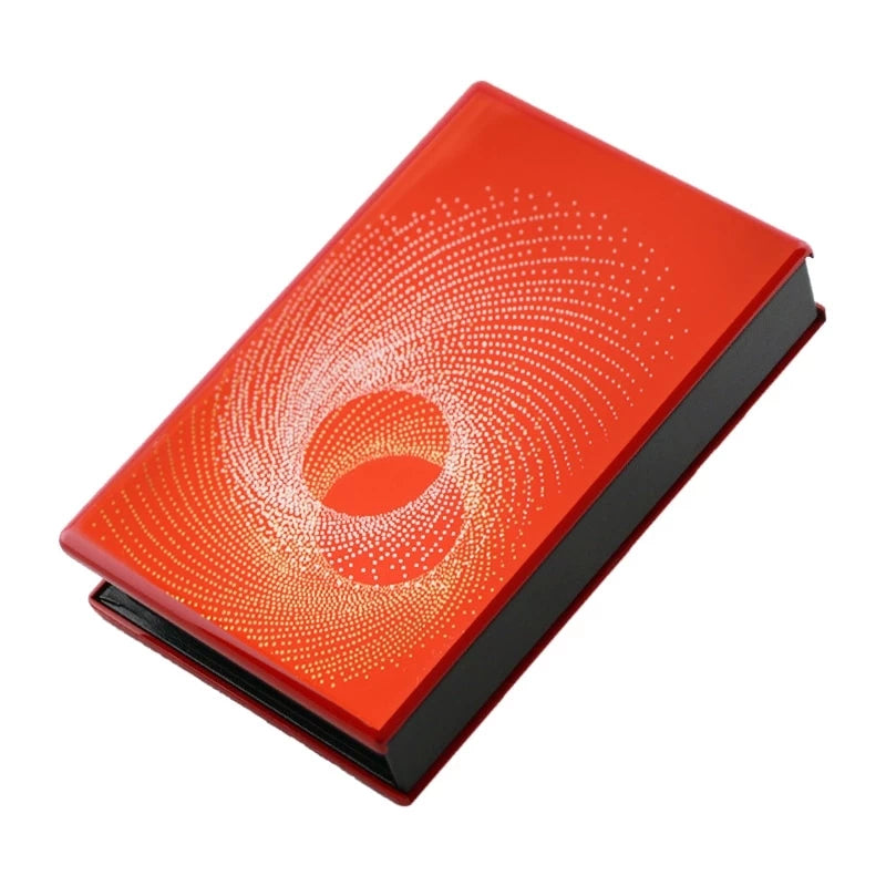 持ち運びも可能な携帯型位牌。朱色をベースに「光飛」の蒔絵が施された大人の雰囲気です。