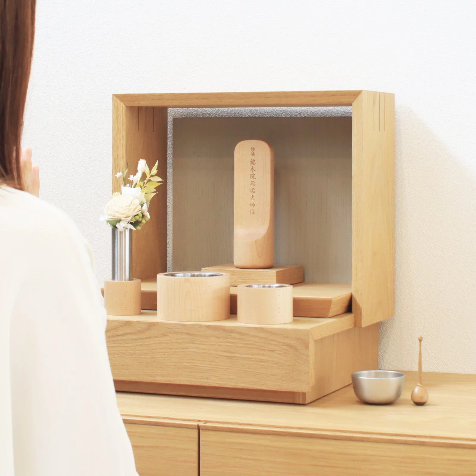 「SUQQUE」は、無垢材ならではの温かみを活かし、シンプルながらも洗練されたデザインが特徴の位牌です。メープルのやわらかな色合いと滑らかなフォルムは、リビングにも自然に馴染み、ご供養の場に穏やかな雰囲気をもたらしてくれるかと存じます。