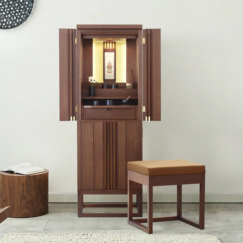 また、下台に収納可能な椅子と経机が付属しますので、腰かけても正座でもお参りできる仕様となっております。