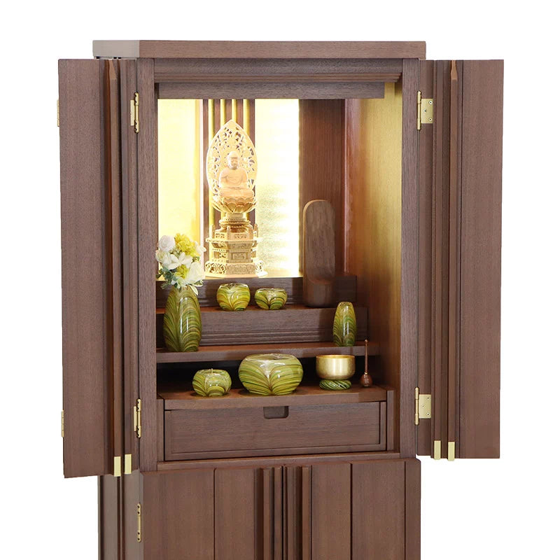 • 特 徴: LEDライト 、 一本立ちタイプ 、 内部段取り外し可 、 スライド式内部段 、 引き出し収納 、 経机付き 、 柾目の直線が多めの木目 、 床置きタイプ 、 セット仏壇の仏具シュミレーションあり 、 脚付き