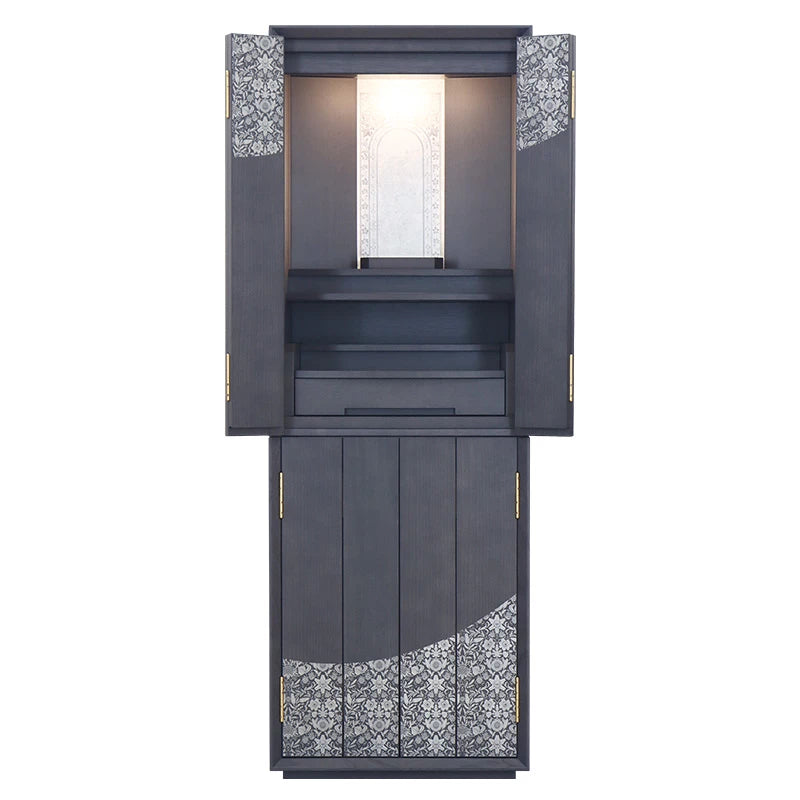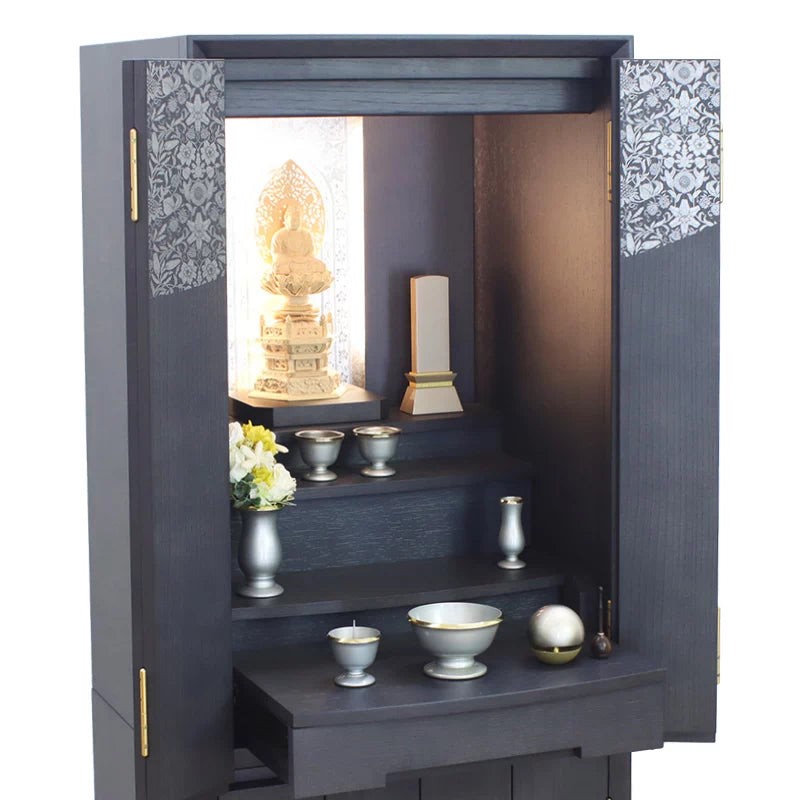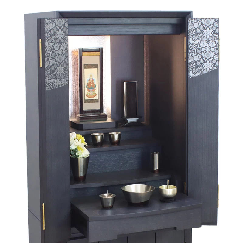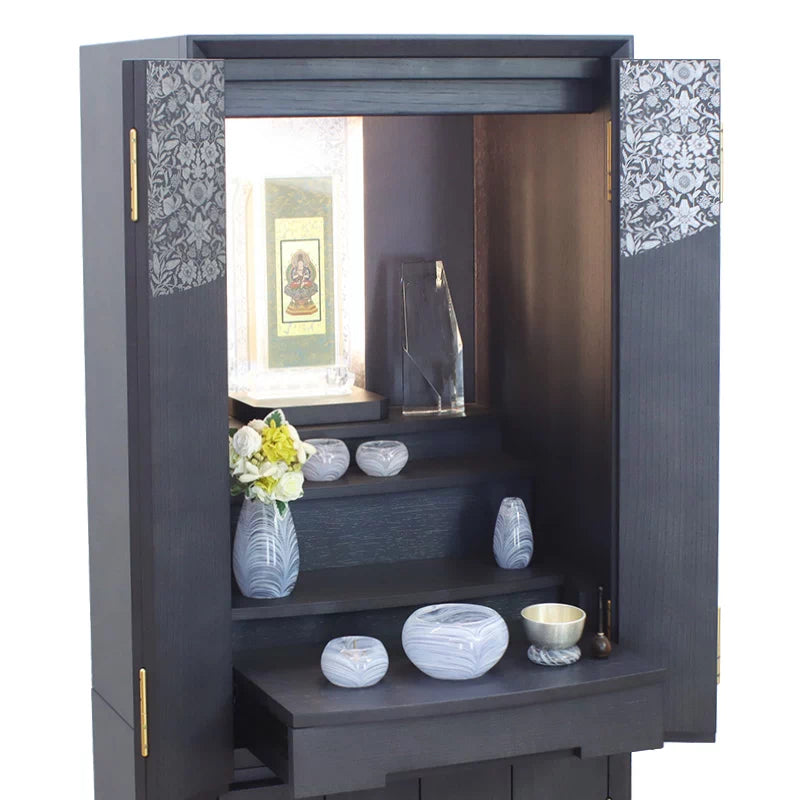 草花の蒔絵を施した国産デザイン仏壇。経机が付属します。