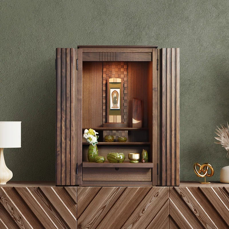 上質なウォールナット材をふんだんに使用したインテリアのようなお仏壇「森樹」。戸板と側面に無垢材でストライプの装飾を施したデザイン性の高い仕上がりとなっております。