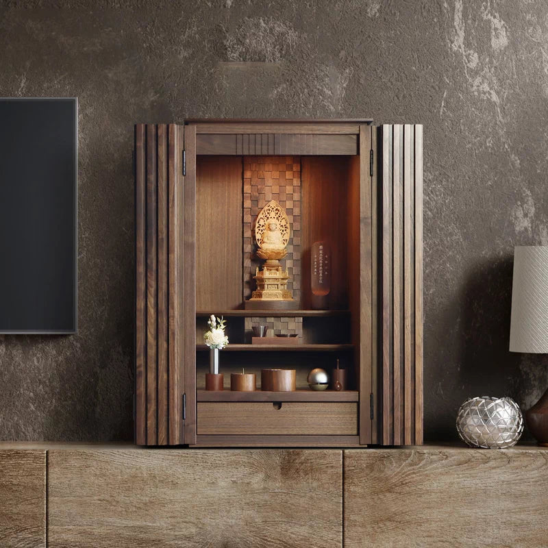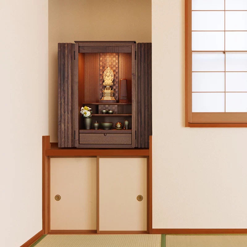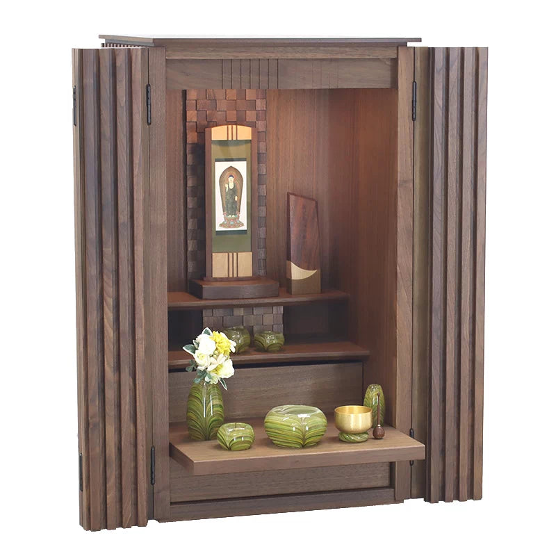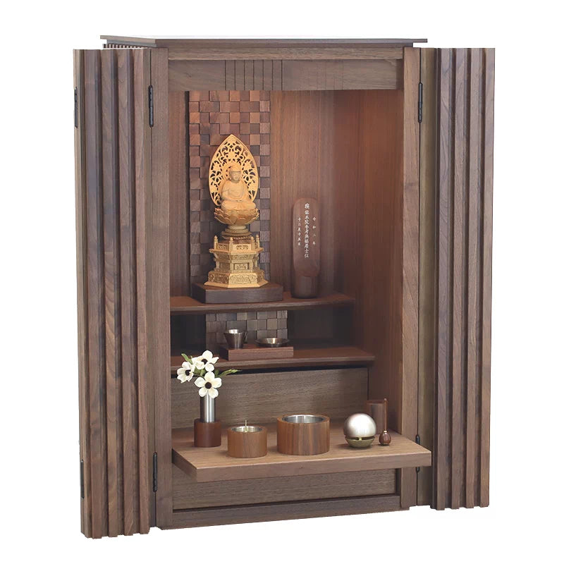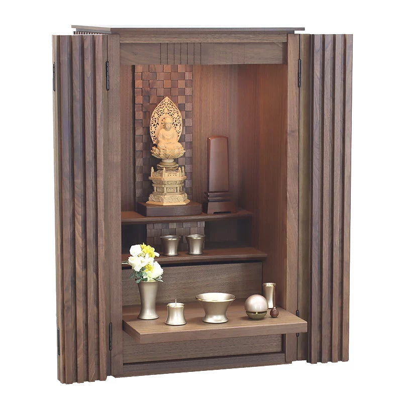 ウォールナットの風合いを活かした国産上置き仏壇。和室の地袋にも合う大型タイプ。