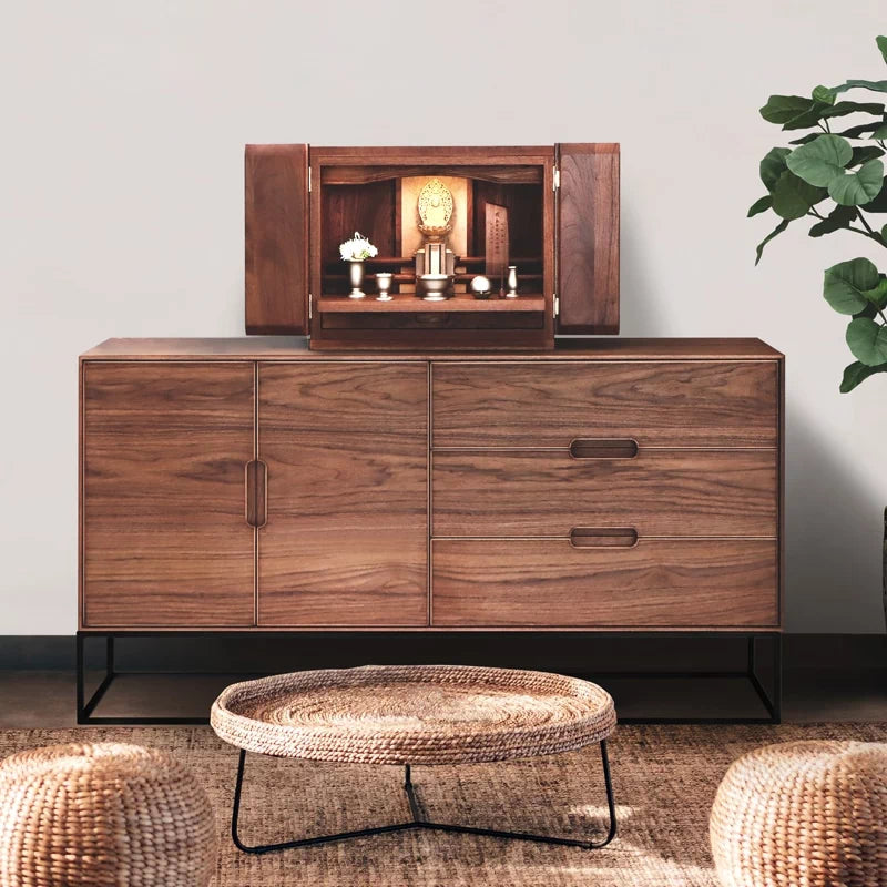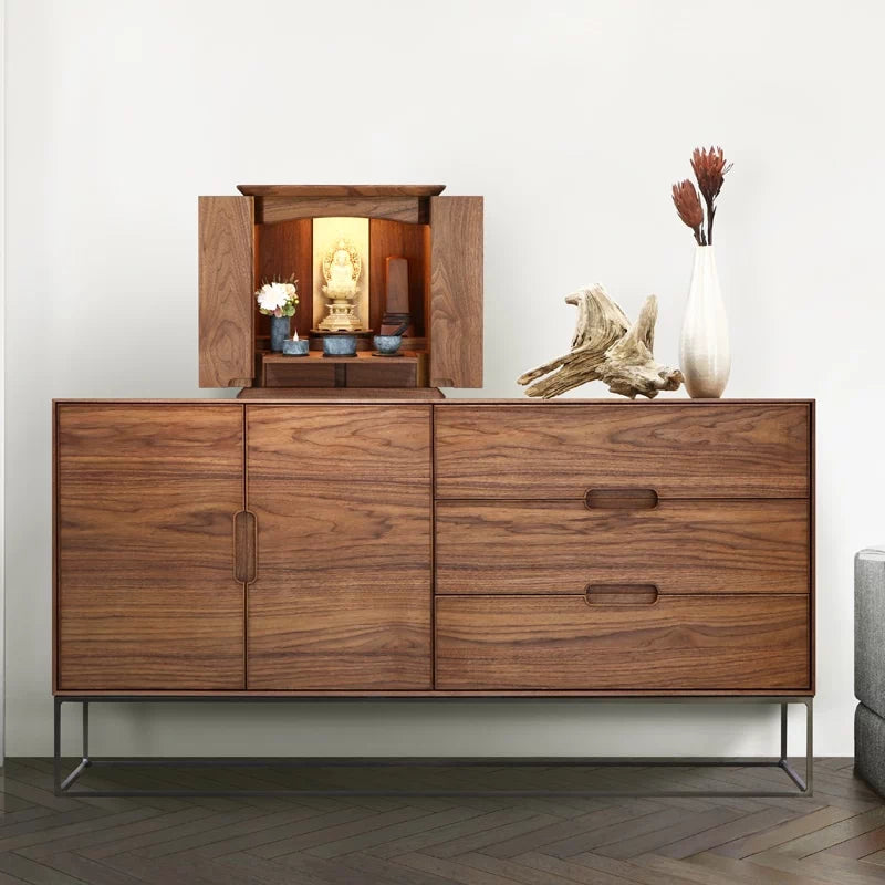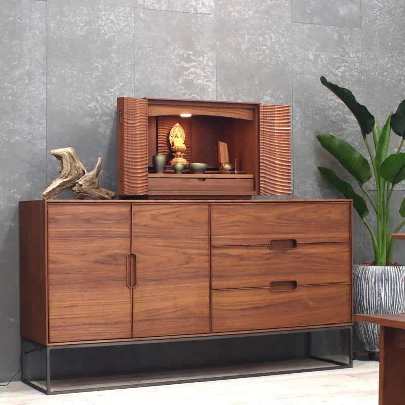 近年、お客様の購入内容をみると当店では「家具(サイドボード・チェスト)」の販売が非常に多くなっており、現在では仏壇台よりも出荷台数は多くなっております。お仏壇を家具と合わせて頂くことでお仏壇周りの雰囲気も一段とおしゃれにコーディネートして頂けます。一方、仏壇台の方は「仏具を置くスライド板」が設置されているものが多いのと、仏壇と同じメーカーが色を合わせて製作しているシリーズも一部あります。