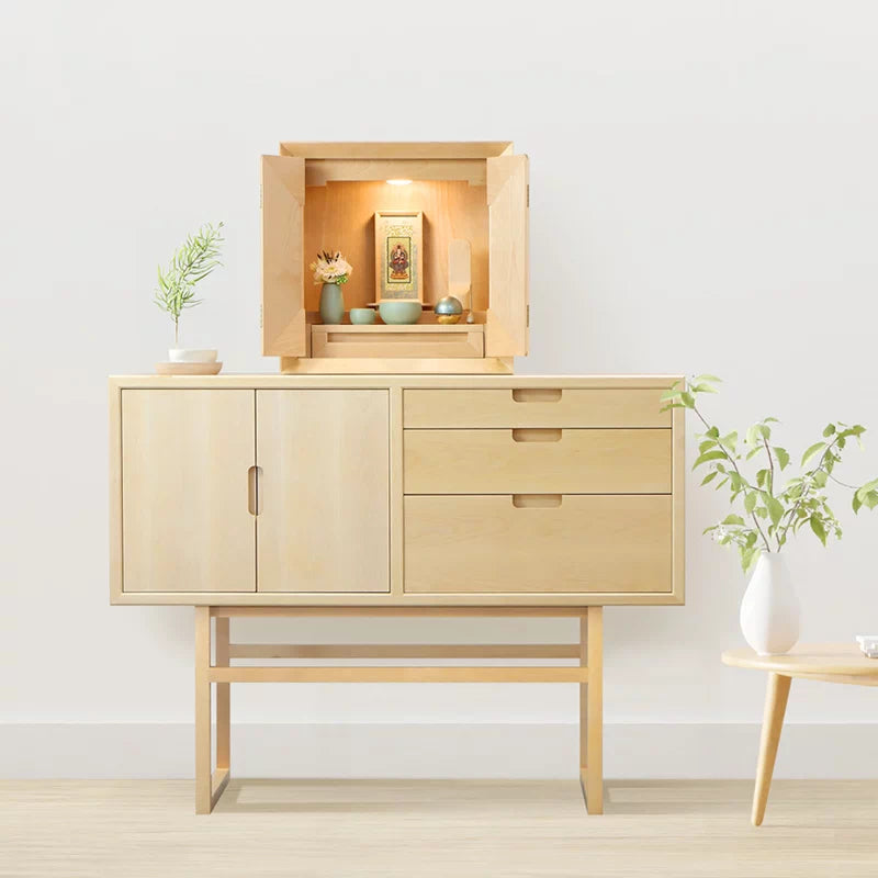 近年、お客様の購入内容をみると当店では「家具(サイドボード・チェスト)」の販売が非常に多くなっており、現在では仏壇台よりも出荷台数は多くなっております。お仏壇を家具と合わせて頂くことでお仏壇周りの雰囲気も一段とおしゃれにコーディネートして頂けます。一方、仏壇台の方は「仏具を置くスライド板」が設置されているものが多いのと、仏壇と同じメーカーが色を合わせて製作しているシリーズも一部あります。