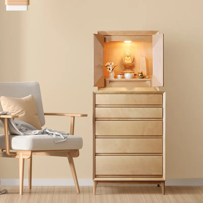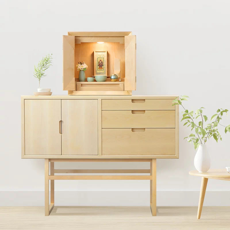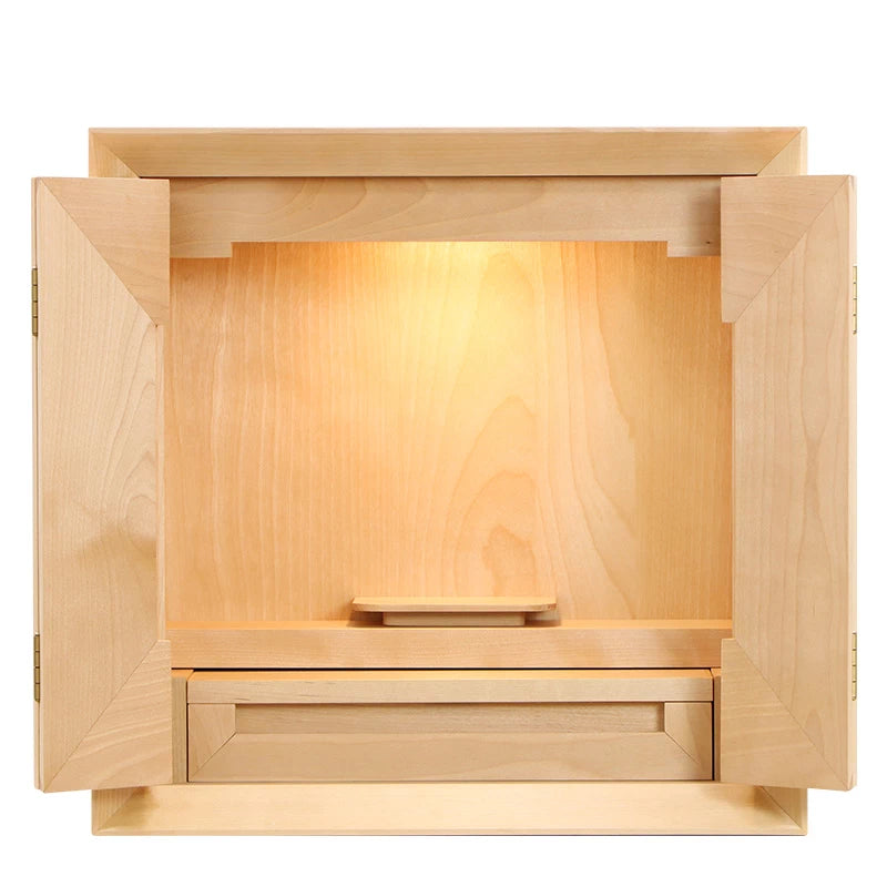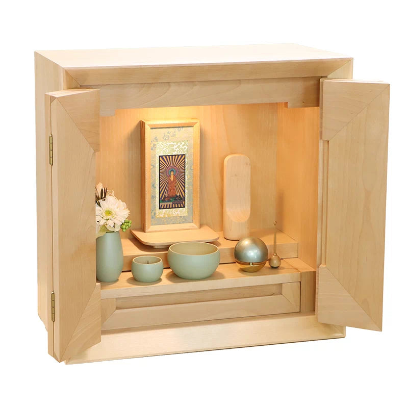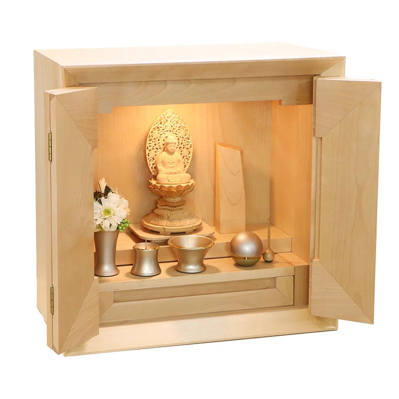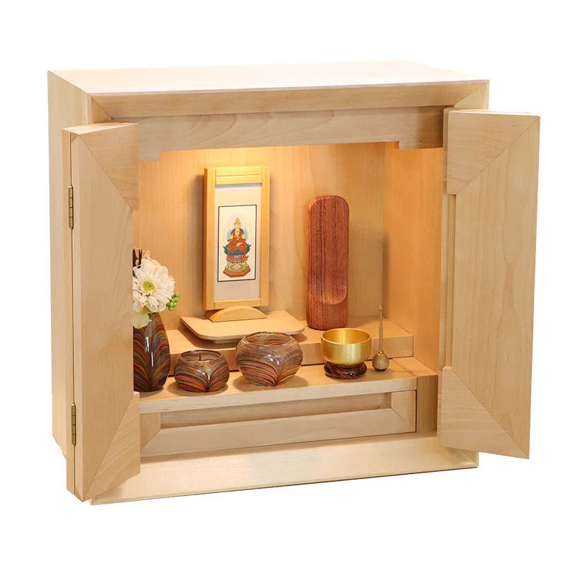 • 特 徴: 国産品 、 LEDライト 、 無垢材8割以上 、 板目のランダムな木目 、 本尊台あり 、 スライド式内部段 、 引き出し収納 、 セット仏壇の仏具シュミレーションあり 、 台の上に設置するタイプ