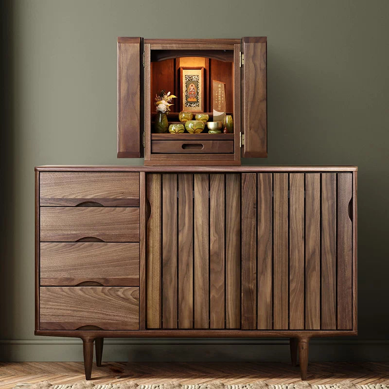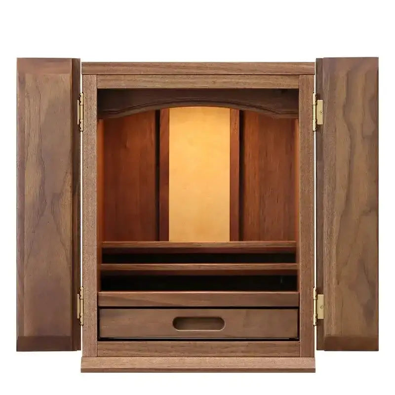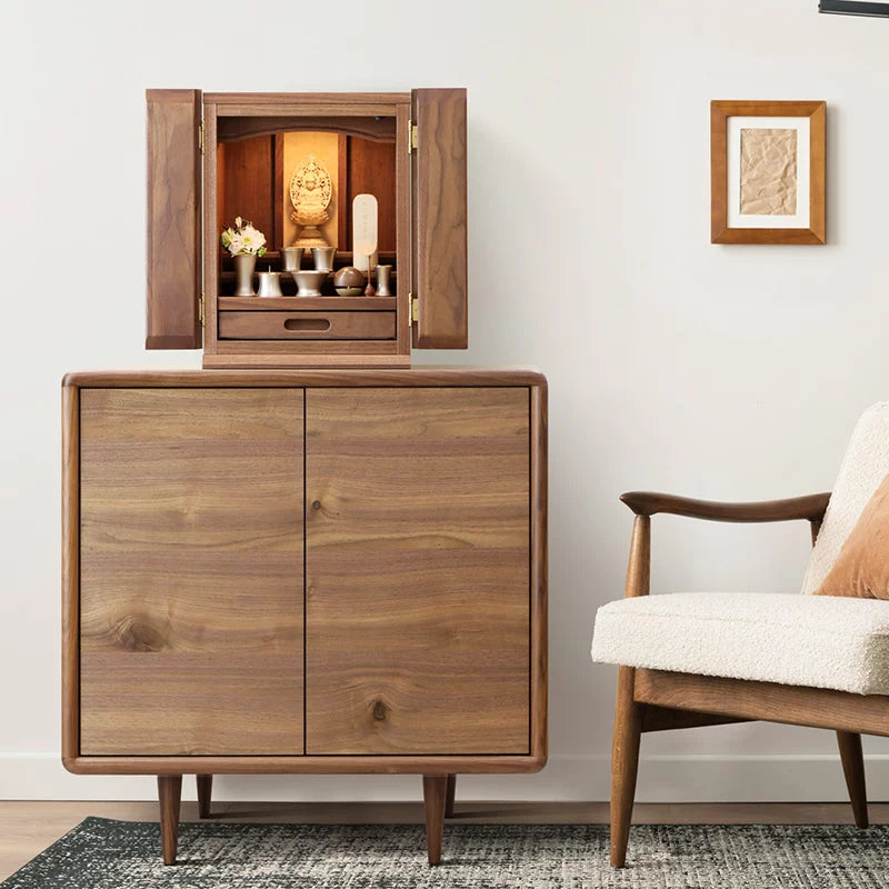 ウォールナット材の風合いを活かしたインテリアのようなモダン仏壇。天然の木目やフシなど、木の個性を味わうことできます。戸板(扉)部分は無垢材を贅沢に使用。丸く面取りされたあたたかみのあるやさしいデザインです。