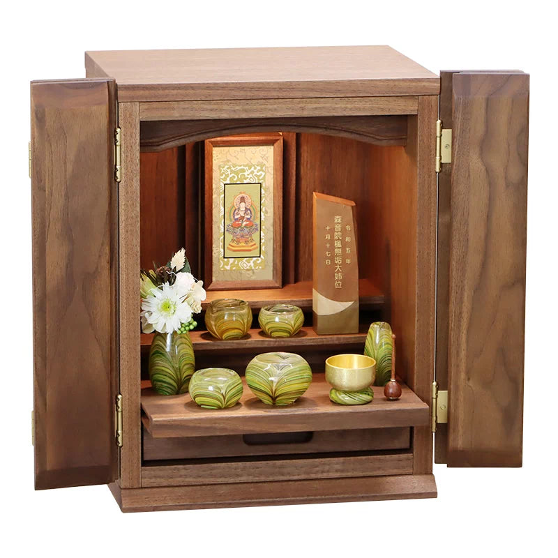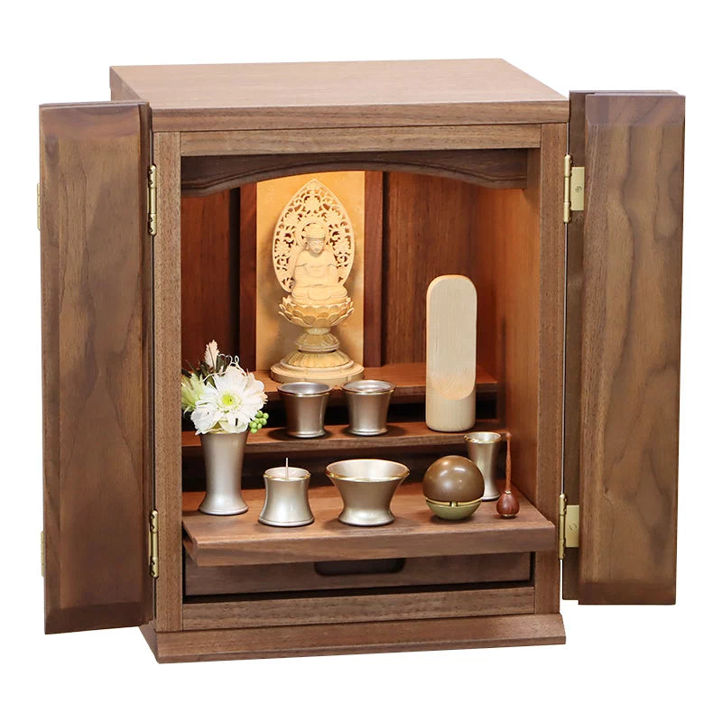 • 特 徴: 国産品 、 LEDライト 、 無垢材3割以上 、 板目のランダムな木目 、 スライド式内部段 、 引き出し収納 、 セット仏壇の仏具シュミレーションあり 、 台の上に設置するタイプ