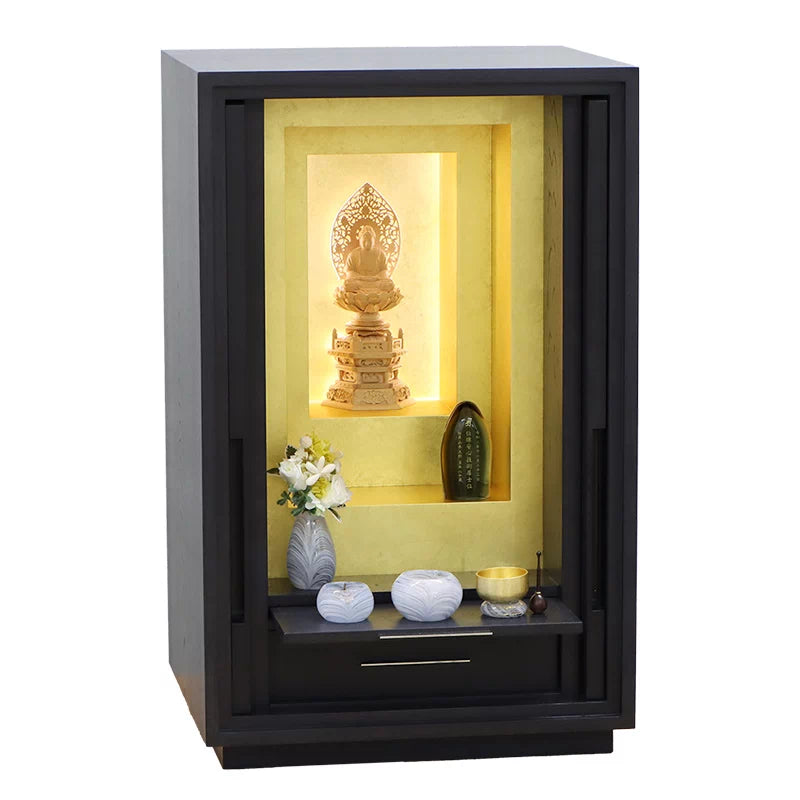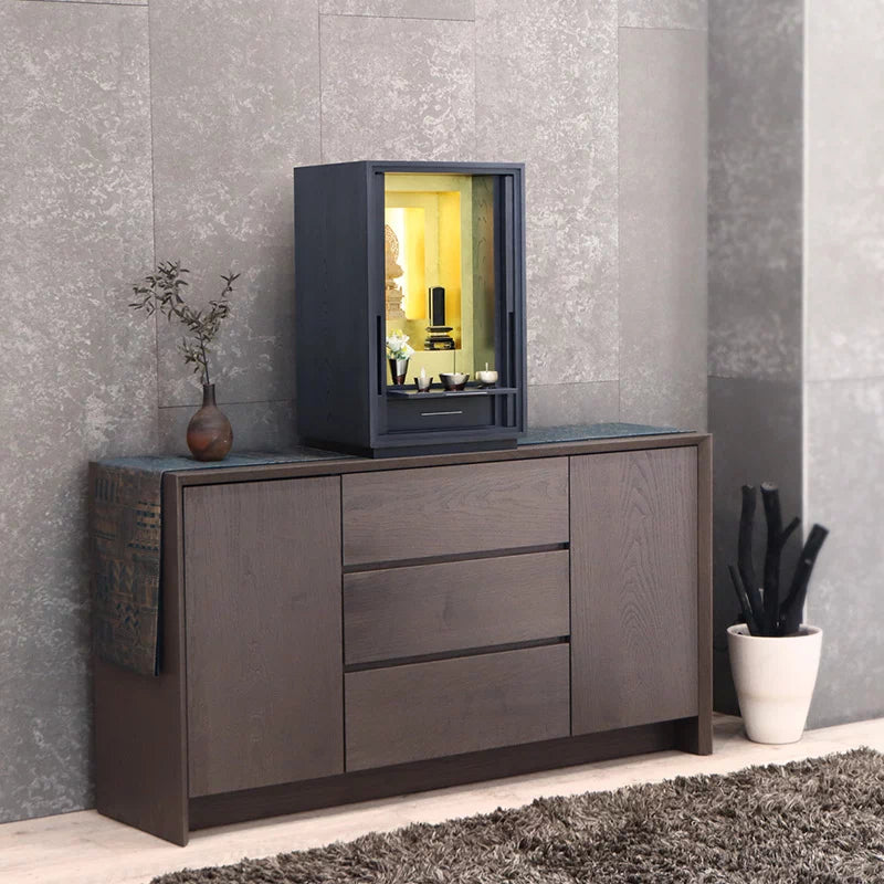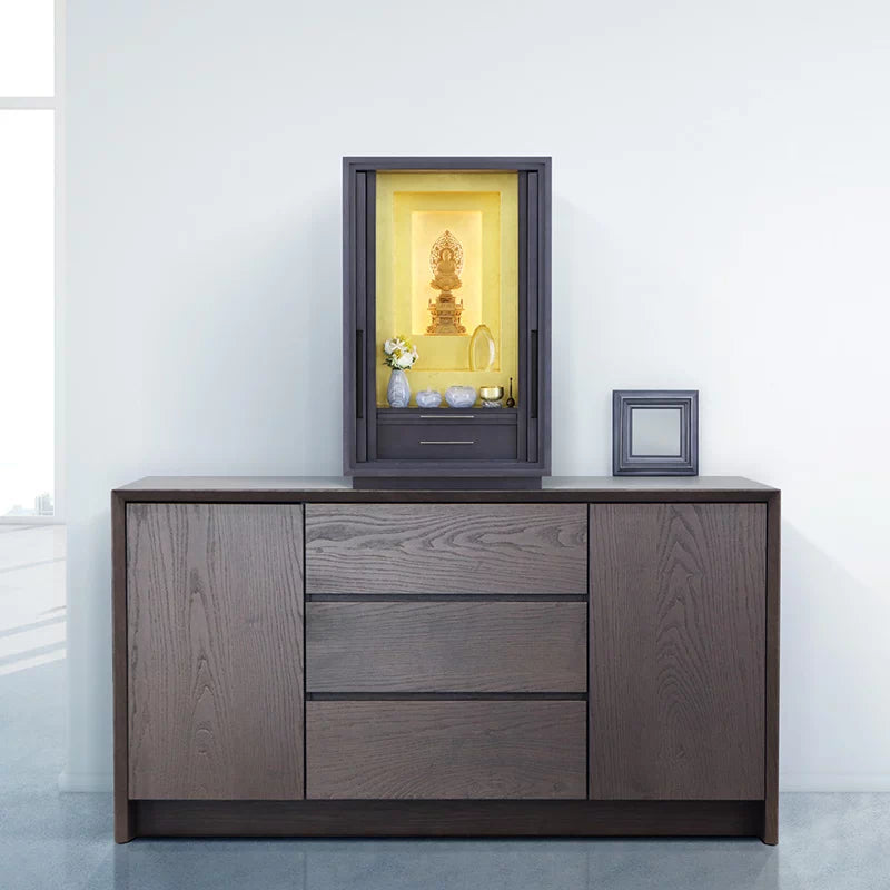 • 特 徴: 国産品 、 LEDライト 、 扉スリム設計 、 仏具板 、 引き出し収納 、 柾目の直線が多めの木目 、 有名デザイナー商品 、 セット仏壇の仏具シュミレーションあり 、 台の上に設置するタイプ