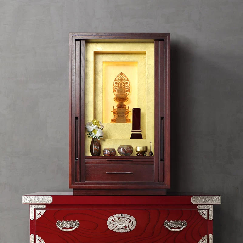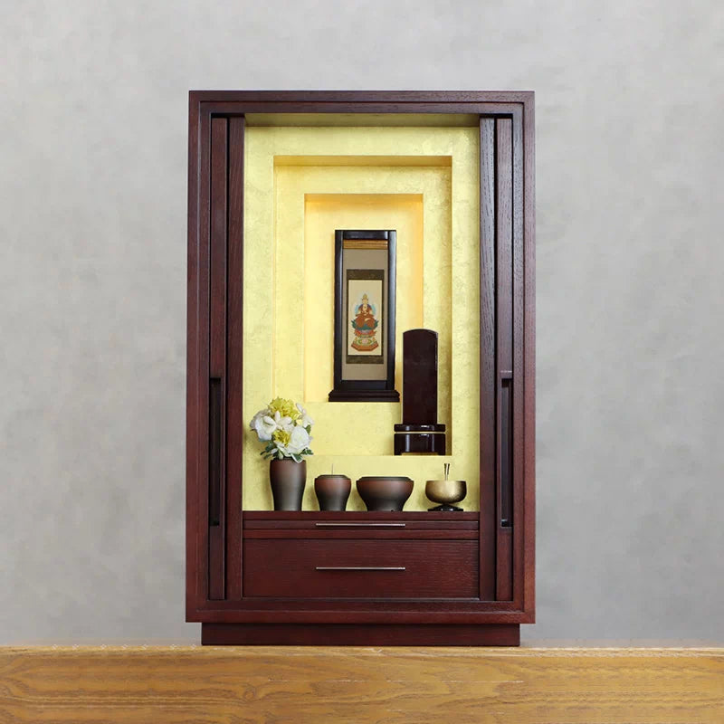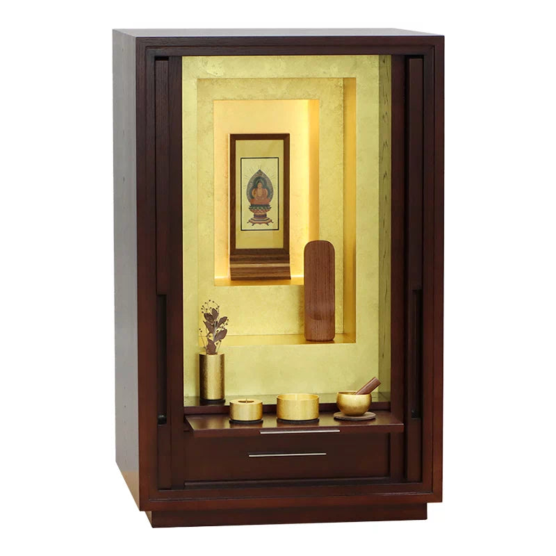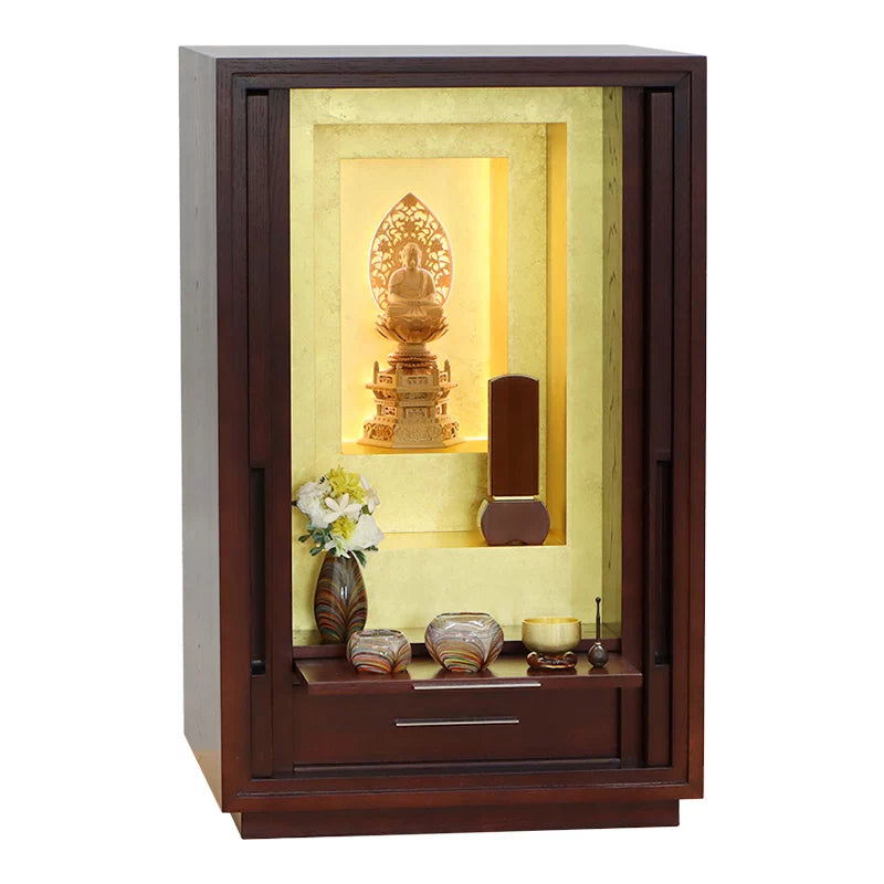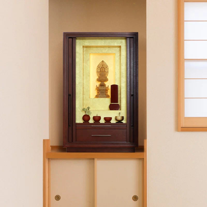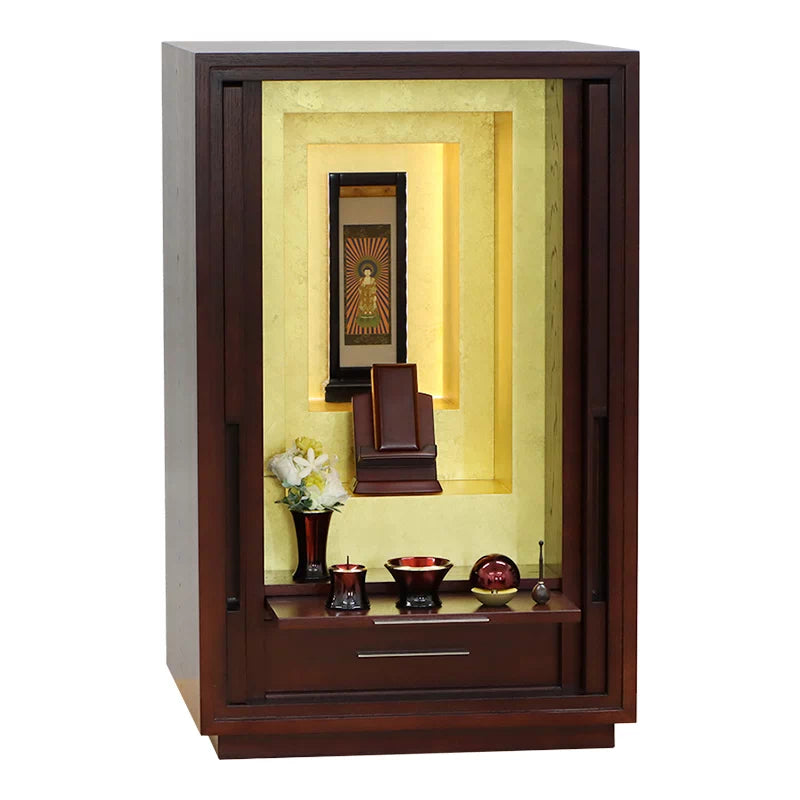 • 特 徴: 国産品 、 LEDライト 、 扉スリム設計 、 引き出し収納 、 仏具板 、 柾目の直線が多めの木目 、 有名デザイナー商品 、 セット仏壇の仏具シュミレーションあり 、 台の上に設置するタイプ
