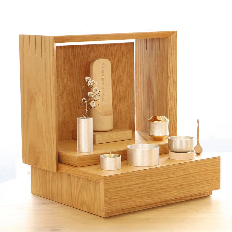 • ご本尊とお位牌を設ける場合:故人様のお位牌のすぐそばにミニ骨壺を飾り、お飾りするのが自然でしょう。