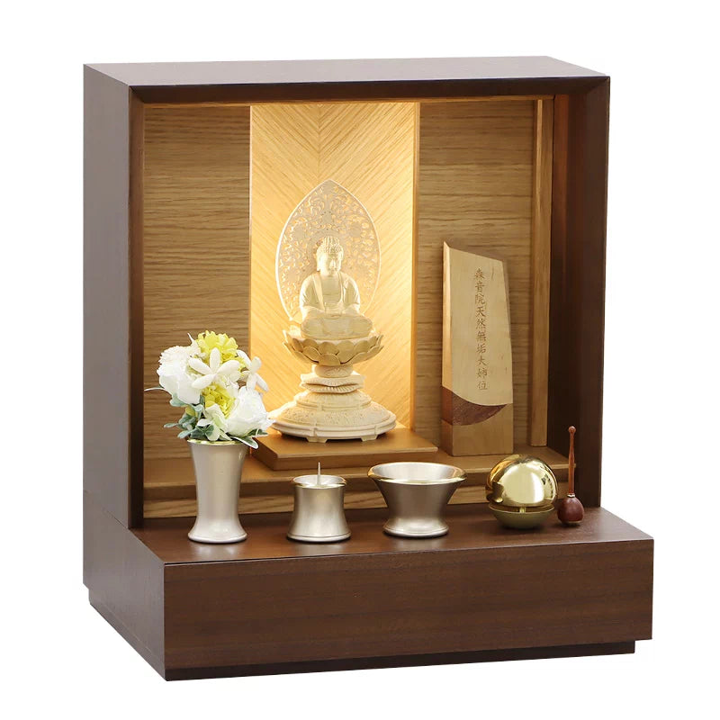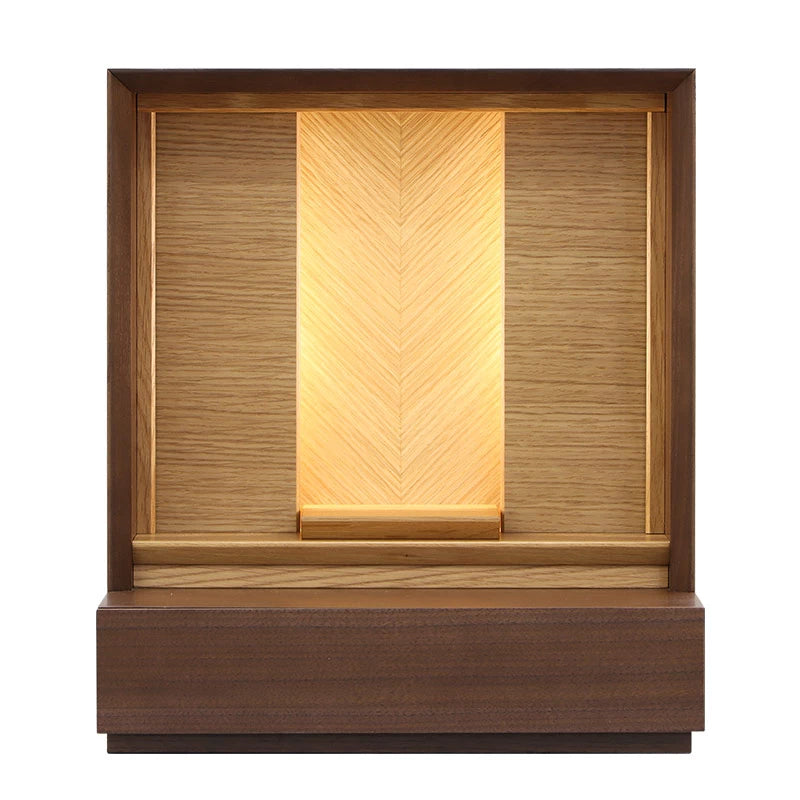 インテリアに調和する、扉のないすっきりとしたオープンタイプのお仏壇です。天然の木目を活かした矢羽根貼りの背板や木材の面取り装飾など、シンプルながらもデザイン性の高い仕上がりとなっております。
