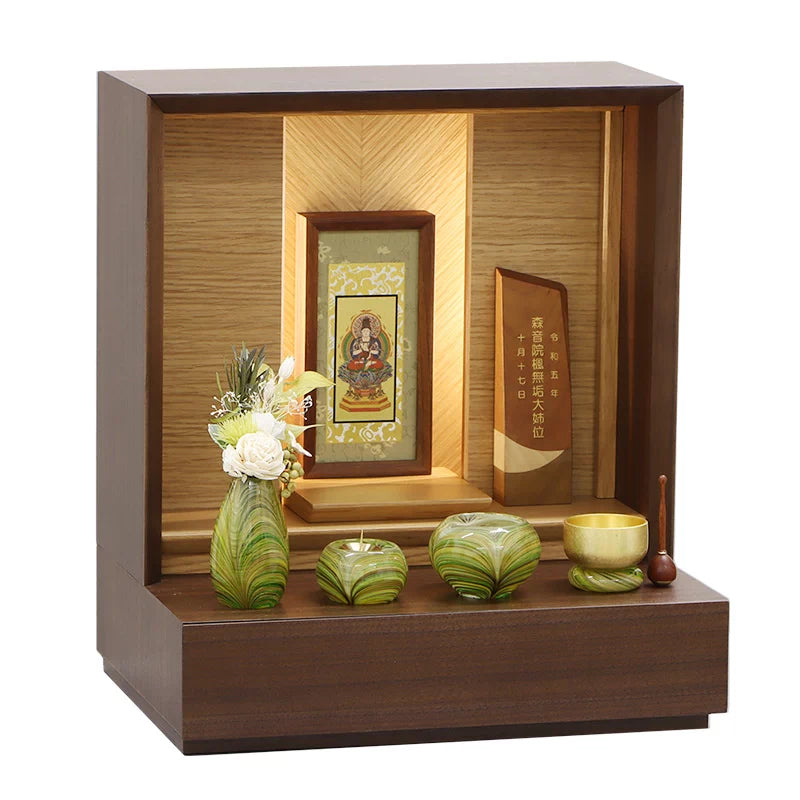• 特 徴: 国産品 、 引き出し収納 、 本尊台あり 、 柾目の直線が多めの木目 、 セット仏壇の仏具シュミレーションあり 、 台の上に設置するタイプ