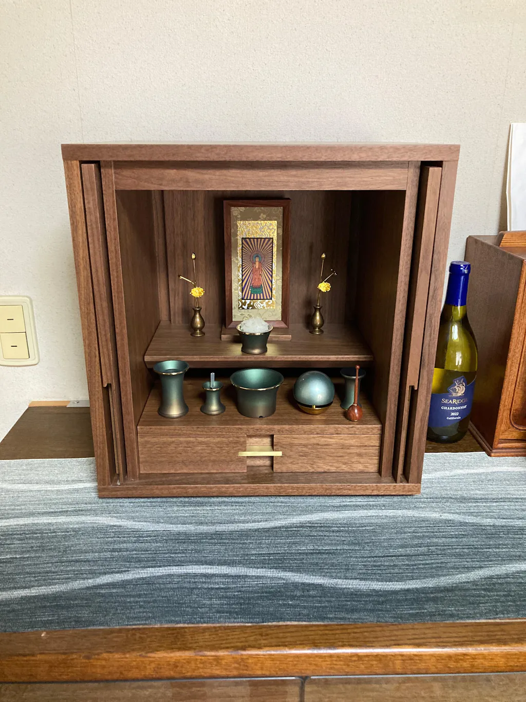 • 特 徴: 国産品 、 ルミエールオリジナル品 、 LEDライト 、 扉スリム設計 、 本尊台あり 、 スライド式内部段 、 引き出し収納 、 板目のランダムな木目 、 セット仏壇の仏具シュミレーションあり 、 台の上に設置するタイプ