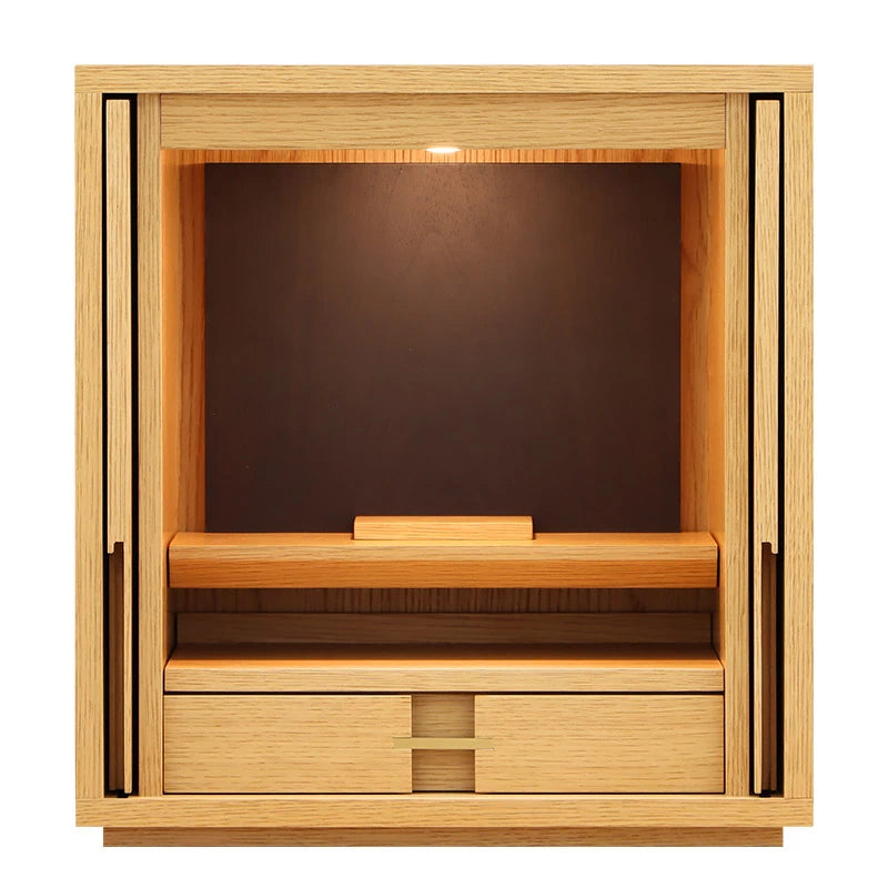 • 特 徴: 国産品 、 ルミエールオリジナル品 、 LEDライト 、 扉スリム設計 、 本尊台あり 、 スライド式内部段 、 引き出し収納 、 板目のランダムな木目 、 セット仏壇の仏具シュミレーションあり 、 台の上に設置するタイプ