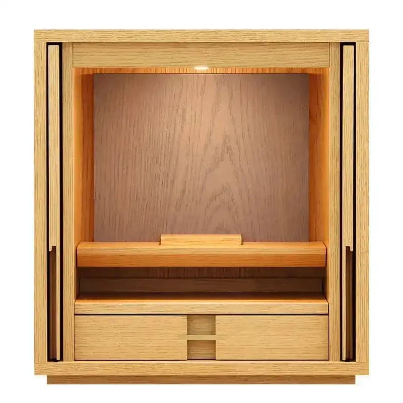 • 特 徴: 国産品 、 ルミエールオリジナル品 、 LEDライト 、 扉スリム設計 、 本尊台あり 、 スライド式内部段 、 引き出し収納 、 板目のランダムな木目 、 セット仏壇の仏具シュミレーションあり 、 台の上に設置するタイプ