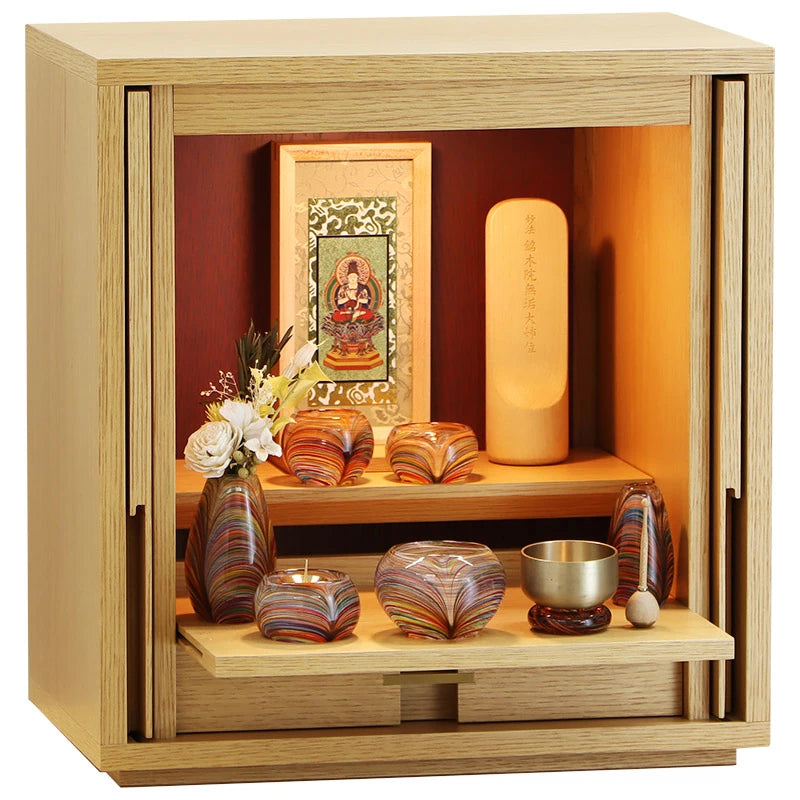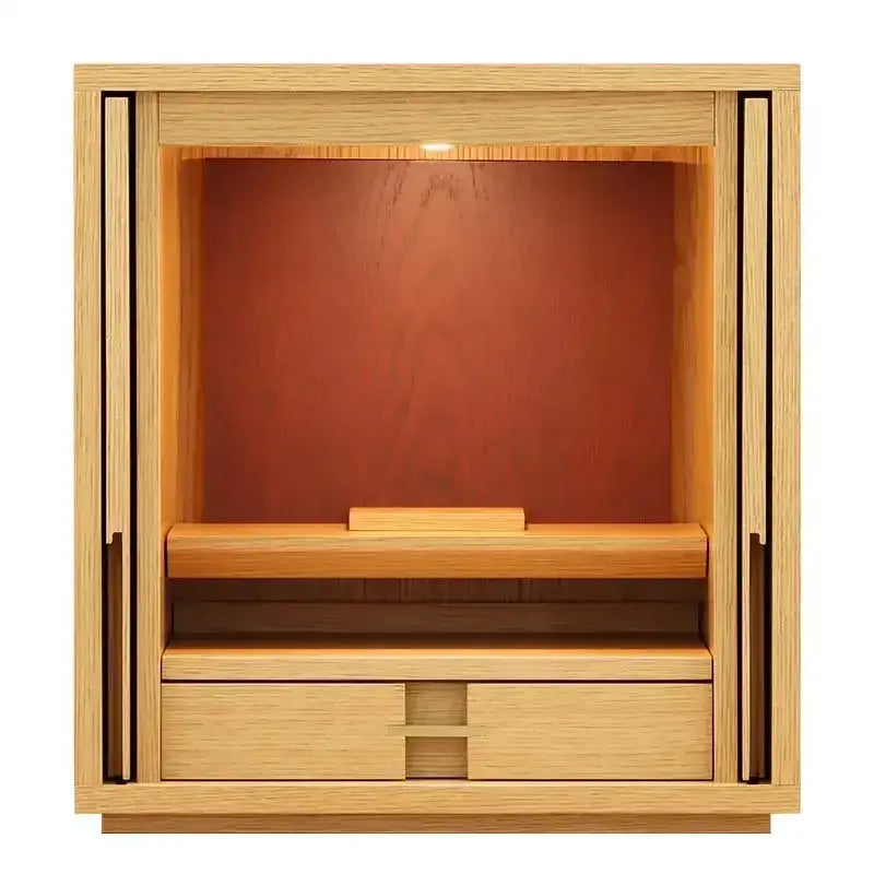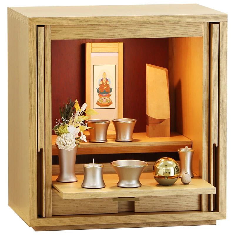 • 特 徴: 国産品 、 ルミエールオリジナル品 、 LEDライト 、 扉スリム設計 、 本尊台あり 、 スライド式内部段 、 引き出し収納 、 板目のランダムな木目 、 セット仏壇の仏具シュミレーションあり 、 台の上に設置するタイプ