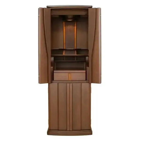 • 特 徴: LEDライト 、 スライド式内部段 、 引き出し収納×2 、 経机付き 、 7寸骨箱収納可能 、 柾目の直線が多めの木目 、 床置きタイプ 、 セット仏壇の仏具シュミレーションあり