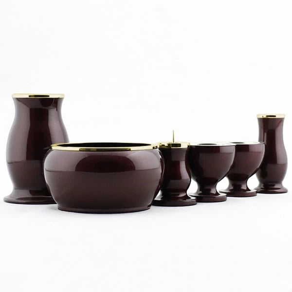 曲線のフォルムがお仏壇に飾った際に優しい雰囲気を作りだします。艶やかな表面は美しく輝き、上品な色調のワインレッドはお仏壇に合わせやすい定番のカラーです。各仏具の開口部の縁取りが高級感と存在感を高めます。
