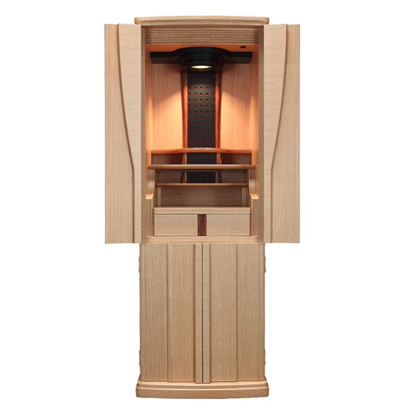 • 特 徴: LEDライト 、 スライド式内部段 、 引き出し収納×2 、 経机付き 、 7寸骨箱収納可能 、 柾目の直線が多めの木目 、 床置きタイプ 、 セット仏壇の仏具シュミレーションあり