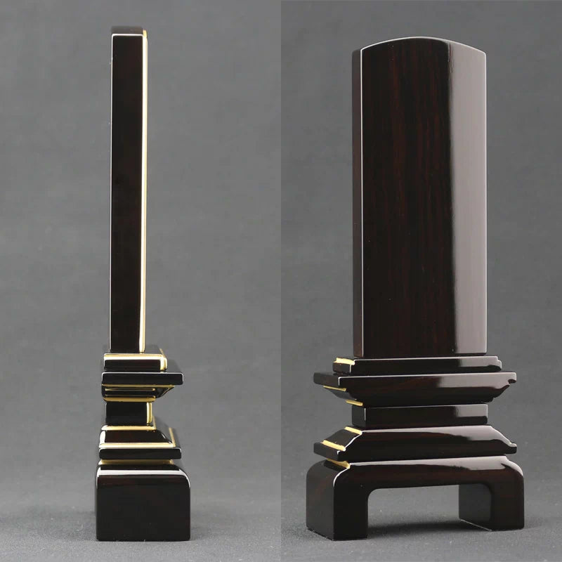 • 正面、正面斜めからのアングル。位牌の木材として最高級木材の黒檀、混合漆を用いて仕上げたお位牌です。