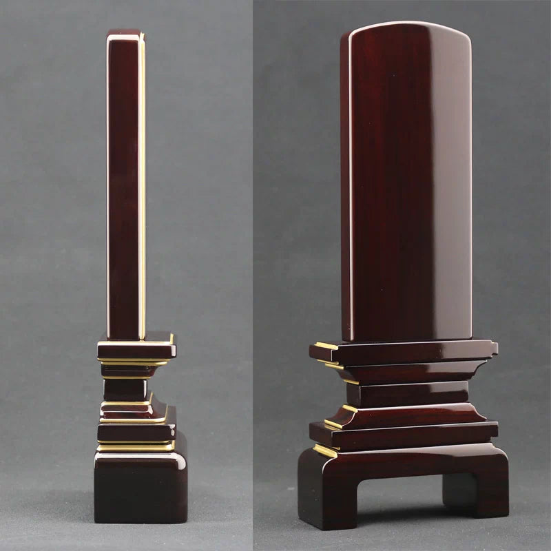 • 正面、正面斜めからのアングル。位牌の木材として最高級木材の紫檀に混合漆で仕上げた上質なお位牌です。